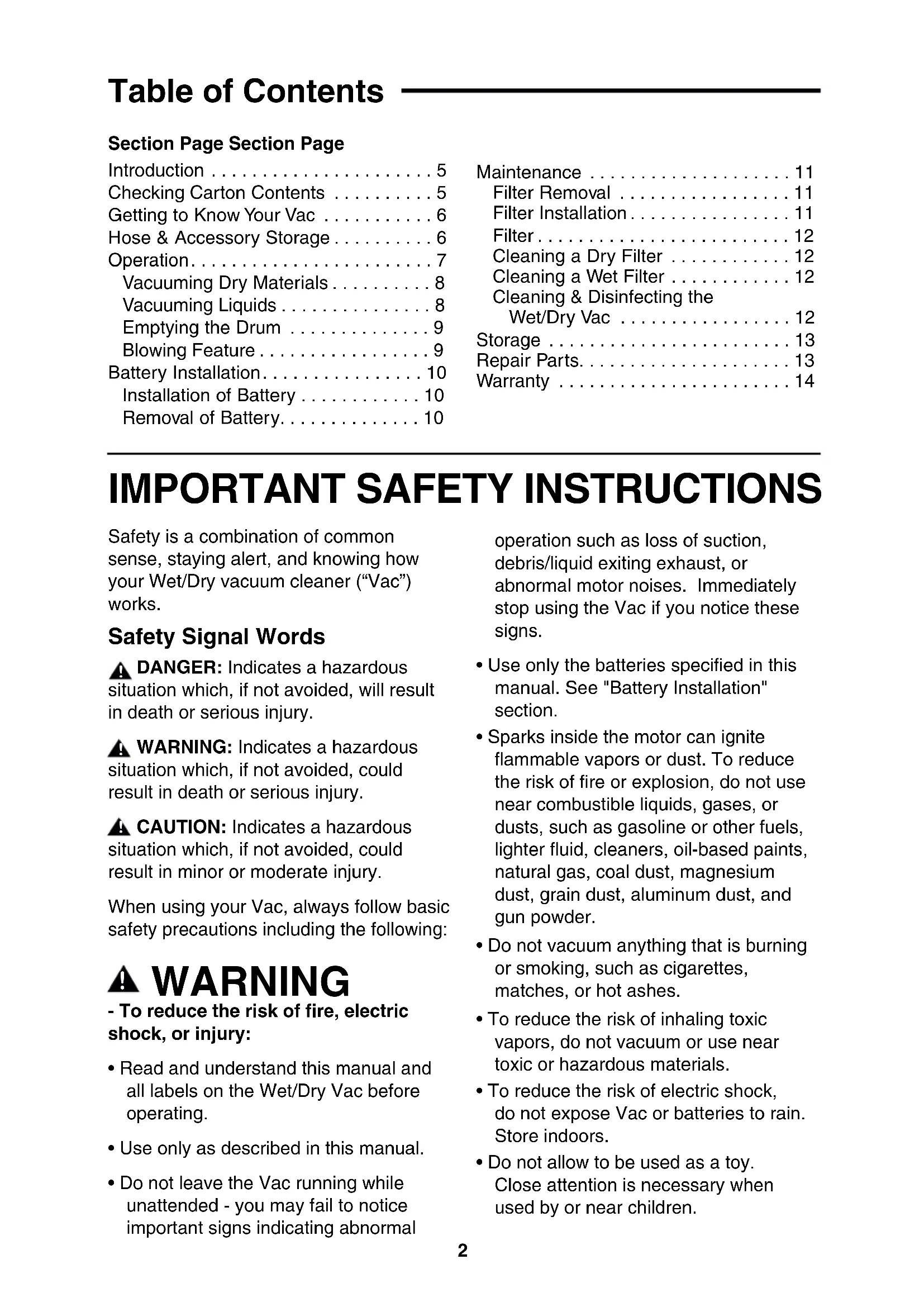 SP6920 ESF 3 gallon.qxp_SP6585 WD4050EX 5/13/14 4:54 PM Page 12 Safety is a combination of common sense, staying alert, and knowing how your Wet/Dry vacuum cleaner (“Vac”) works. Safety Signal Words