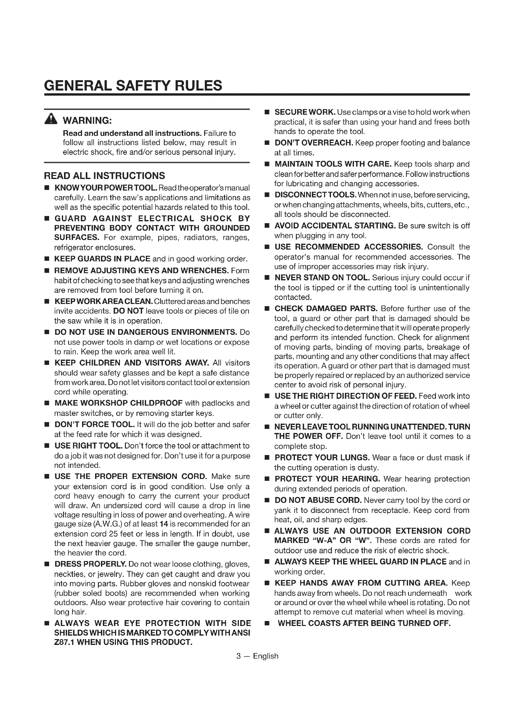 MARKED “W-A” OR “W”. These cords are rated for outdoor use and reduce the risk of electric shock. ALWAYS KEEP THE WHEEL GUARD IN PLACE and in working order. KEEP HANDS AWAY FROM CUTTING AREA. Keep hands away from wheels. Do not reach underneathwork or around or over the wheel while wheel is rotating. Do not attempt to remove cut material when wheel is moving. WHEEL COASTS AFTER BEING TURNED OFF.4 — English