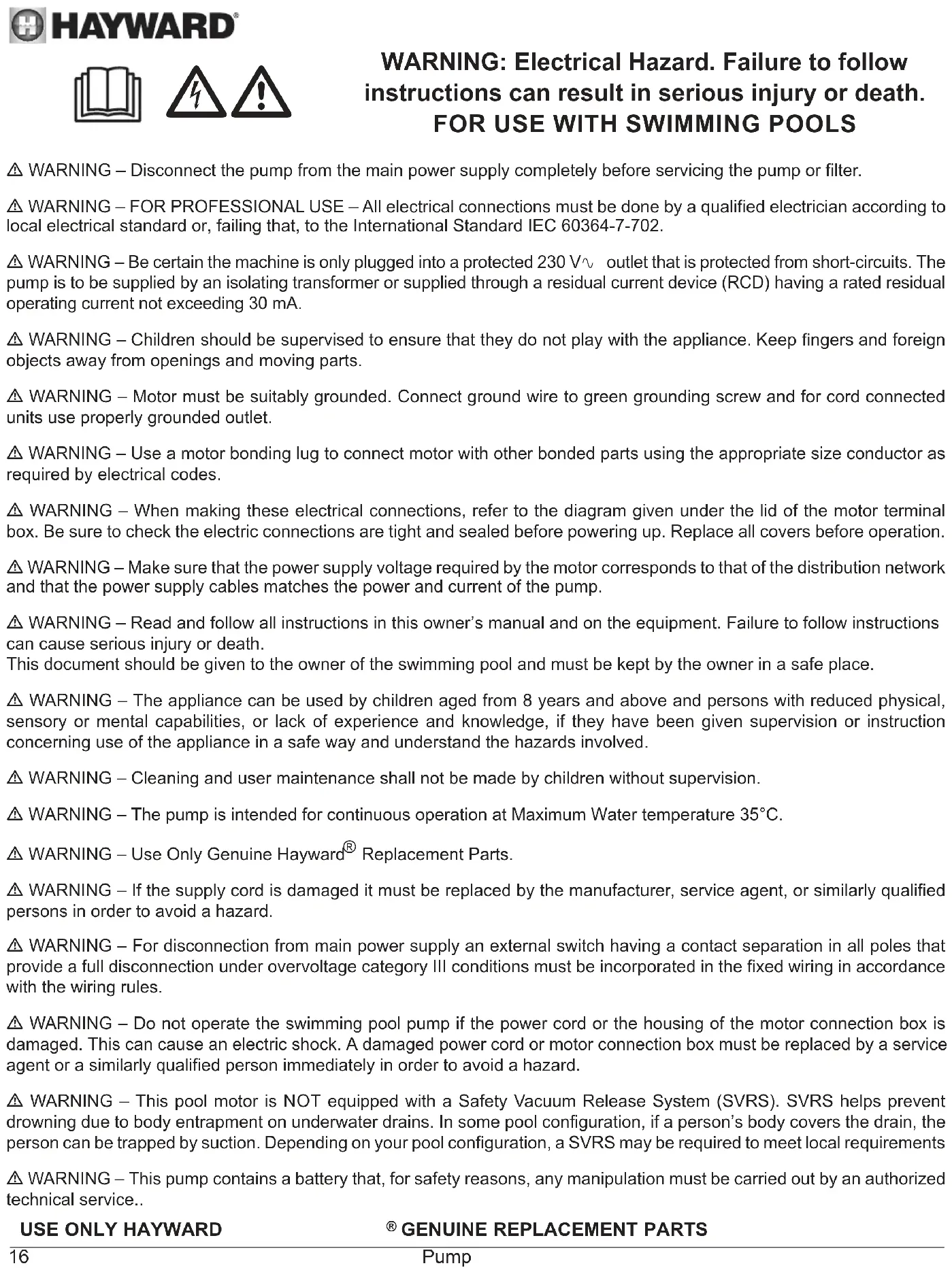 17 Pump GENERAL POINTS Congratulations, you have just acquired a Hayward