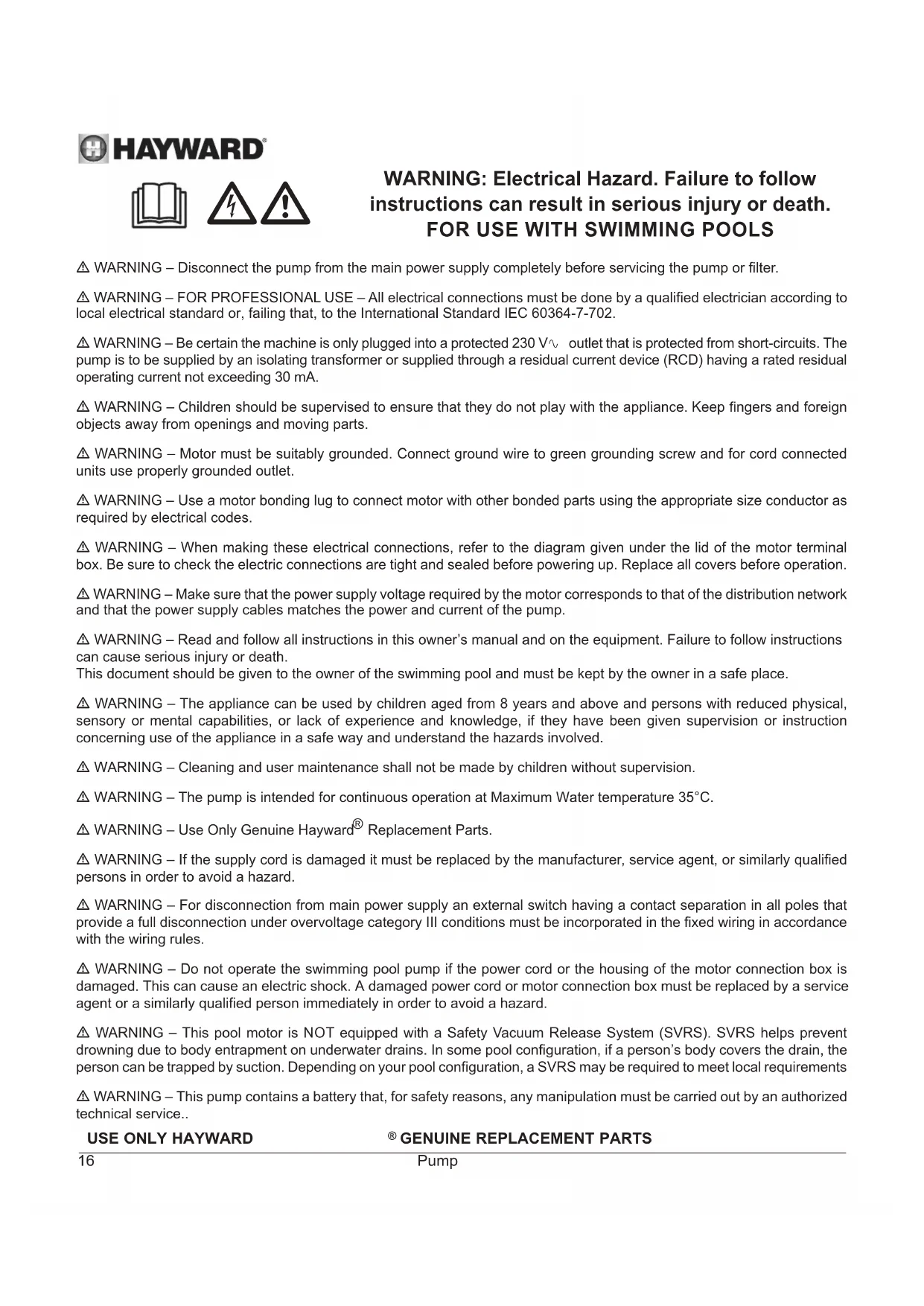 - WARNING: Wait 5 minutes after having totally disconnected the pump from the power supply before carrying out any operation on the motor or the connection box: Danger of electric shock which may cause death. The electric motors fitted to our pumps have thermal protection. This protection reacts in the event of overload or abnormal temperature rise in the motor winding. This protection automatically resets when the winding temperature drops. Whatever the type of motor used, if the regulations require it, a magnetic thermal protection must be installed in addition to the measures described above, which must be calibrated according to the information on the motor's nameplate. The table on page 169 gives the various characteristics of the motors fitted to our pumps.USE ONLY HAYWARD