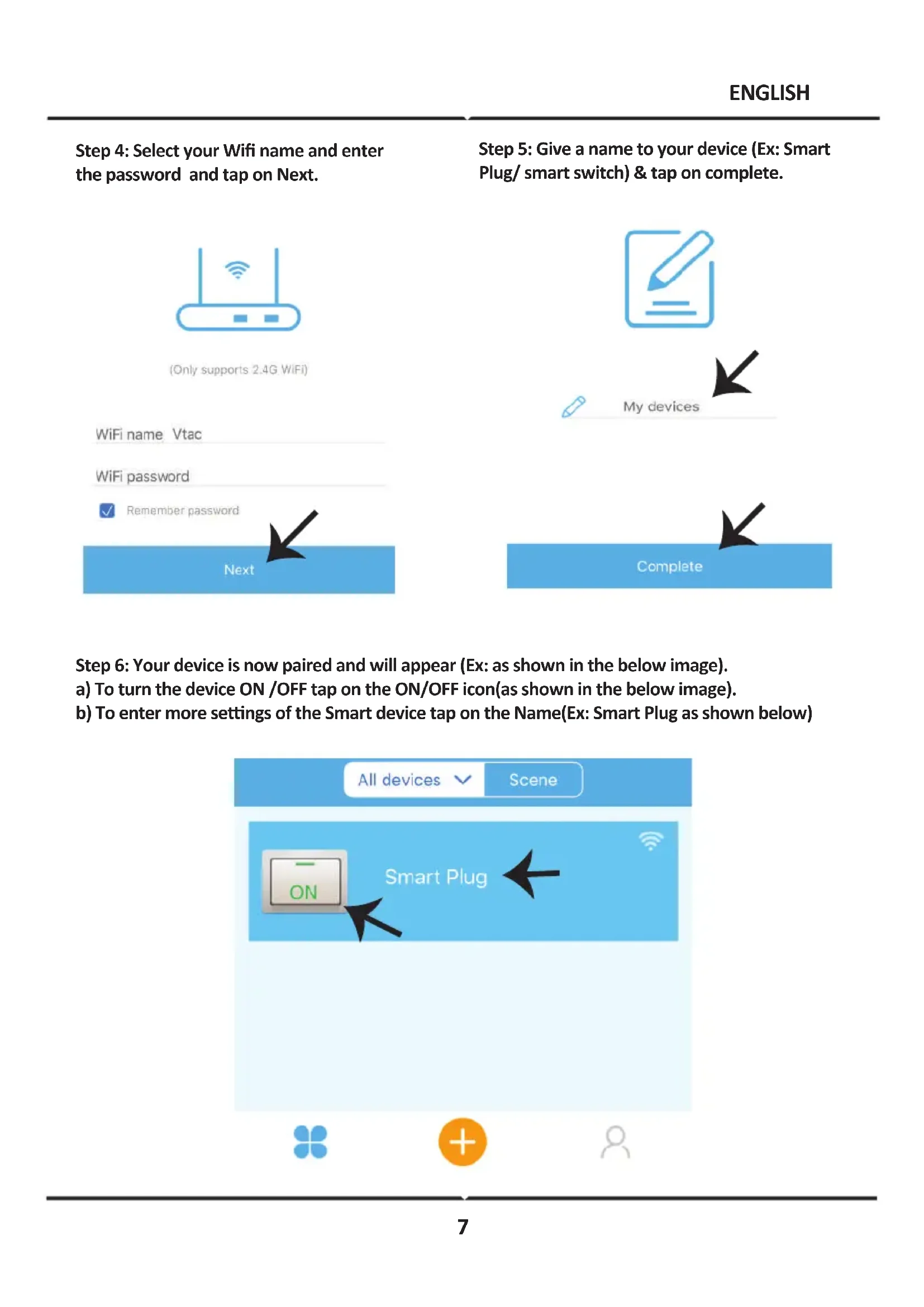 ENGLISHENGLISH 66Step 5: Give a name to your device (Ex: Smart Plug/ smart switch) & tap on complete. Step 6: Your device is now paired and will appear (Ex: as shown in the below image). a) To turn the device ON /OFF tap on the ON/OFF icon(as shown in the below image). b) To enter more sengs of the Smart device tap on the Name(Ex: Smart Plug as shown below) Step 4: Select your Wifi name and enter the password and tap on Next. ENGLISH 7Step 7: V-TAC SMART HOME offers mulple features such as; a) Share - This funcon allows you to share the access with another user. b) Schedule: Schedule mer allows you to turn the device ON/OFF with flexibility of choosing date and me. This feature also allows Repeat mode using which you can set the desired configuraon to daily OR any day of the week. c) Timer : Timer funcon allows you to set “day-hour-minute” using which you can schedule the device to Turn ON/OFF ENGLISH 8Step 1:Install the Amazon Alexa app via the App Store (iOS) or the Play Store (Android) and register. If you already have an exisng account with Amazon Alexa, please proceed to logging in. Step 3: On the Home page of Amazon Alexa App, Tap on the icon as shown on the image below. Step 4: Tap on “Skills & Games” as show below Step 2: Once you are on the Amazon Alexa home page, tap on the lower right icon –– where the arrow is pointed–– to add a new device and Enable Skills. ALEXA SETTINGS ENGLISH 9Step 5: On the Search bar as shown type ”V-TAC Smart Home” and tap on the V-TAC Smart Home skill as shown on the below image. Step 6: Tap on “ENABLE TO USE” to link V-TAC Smart Home skill with Amazon Alexa app. Step 7: Enter Login credenals of V-TAC Smart Home and then tap on Log In. If you do not have a exisng account please register by tapping on the register. Step 8: a)Once you have successfully linked V-TAC Skill close the window & (b)tap on Discover device. Make sure Smart device is paired with V-TAC Smart Home app.