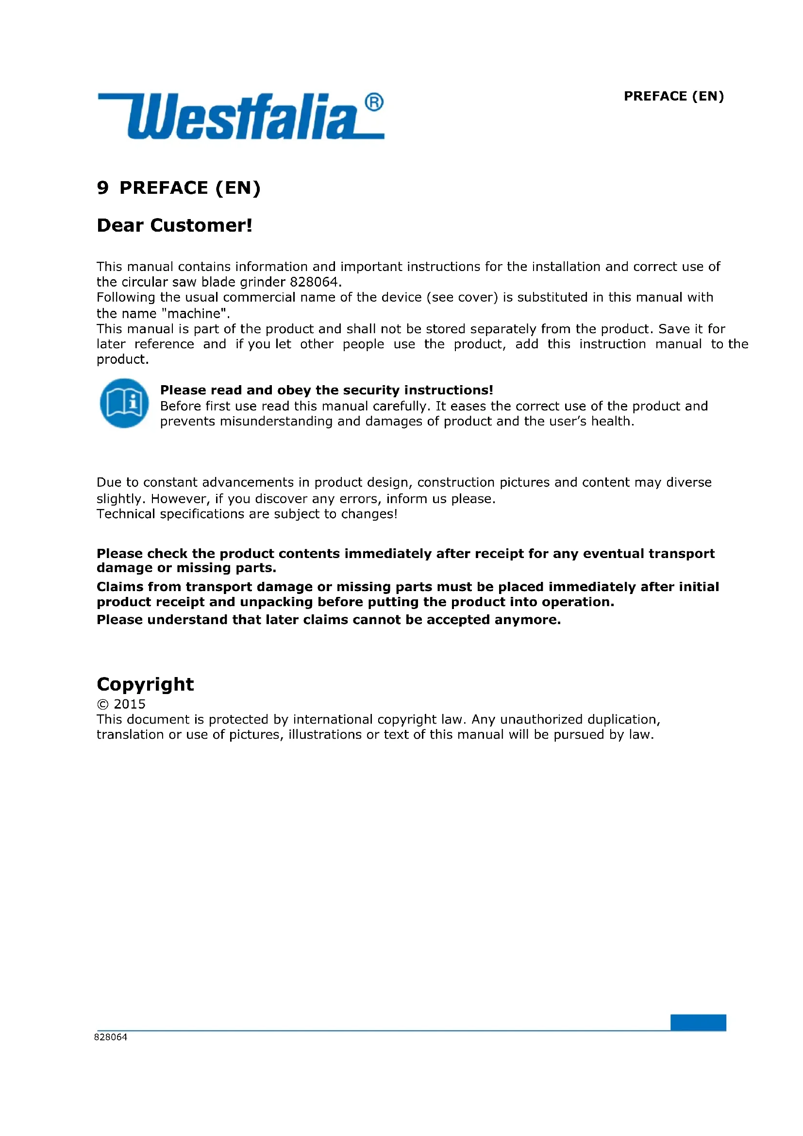 Copyright © 2015 This document is protected by international copyright law. Any unauthorized duplication, translation or use of pictures, illustrations or text of this manual will be pursued by law.SAFETY GUIDELINES 10 SAFETY GUIDELINES