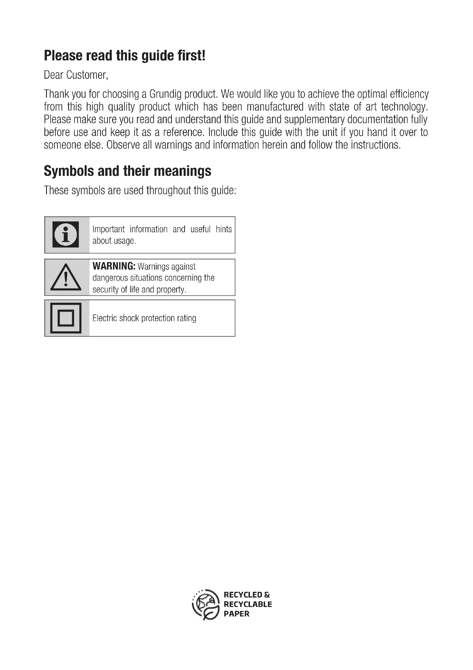 Diese Garantiezusage ist nur gültig innerhalb der Bundesrepublik Deutschland Garantiebedingungen - Grundig - 01/2021 01-21-02Please read this guide first! Dear Customer, Thank you for choosing a Grundig product. We would like you to achieve the optimal efficiency from this high quality product which has been manufactured with state of art technology. Please make sure you read and understand this guide and supplementary documentation fully before use and keep it as a reference. Include this guide with the unit if you hand it over to someone else. Observe all warnings and information herein and follow the instructions. Symbols and their meanings These symbols are used throughout this guide: