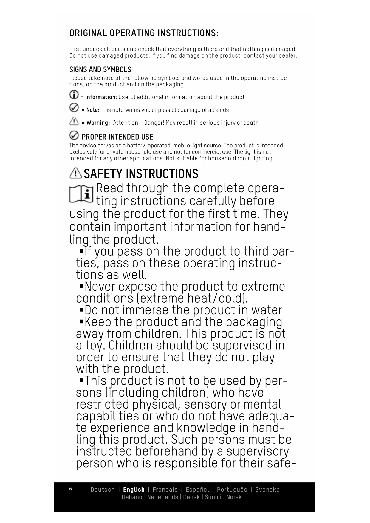 The device serves as a battery-operated, mobile light source. The product is intended exclusively for private household use and not for commercial use. The light is not intended for any other applications. Not suitable for household room lighting SAFETY INSTRUCTIONS Read through the complete opera- ting instructions carefully before using the product for the first time. They contain important information for hand- ling the product. §If you pass on the product to third par- ties, pass on these operating instruc- tions as well. §Never expose the product to extreme conditions (extreme heat/cold). §Do not immerse the product in water §Keep the product and the packaging away from children. This product is not a toy. Children should be supervised in order to ensure that they do not play with the product. §This product is not to be used by per- sons (including children) who have restricted physical, sensory or mental capabilities or who do not have adequa- te experience and knowledge in hand- ling this product. Such persons must be instructed beforehand by a supervisory person who is responsible for their safe- Deutsch | English | Français | Español | Português | Svenska Italiano | Nederlands | Dansk | Suomi | Norsk7 Deutsch | English | Français | Español | Português | Svenska Italiano | Nederlands | Dansk | Suomi | Norsk ty or must be supervised during the use of the product!