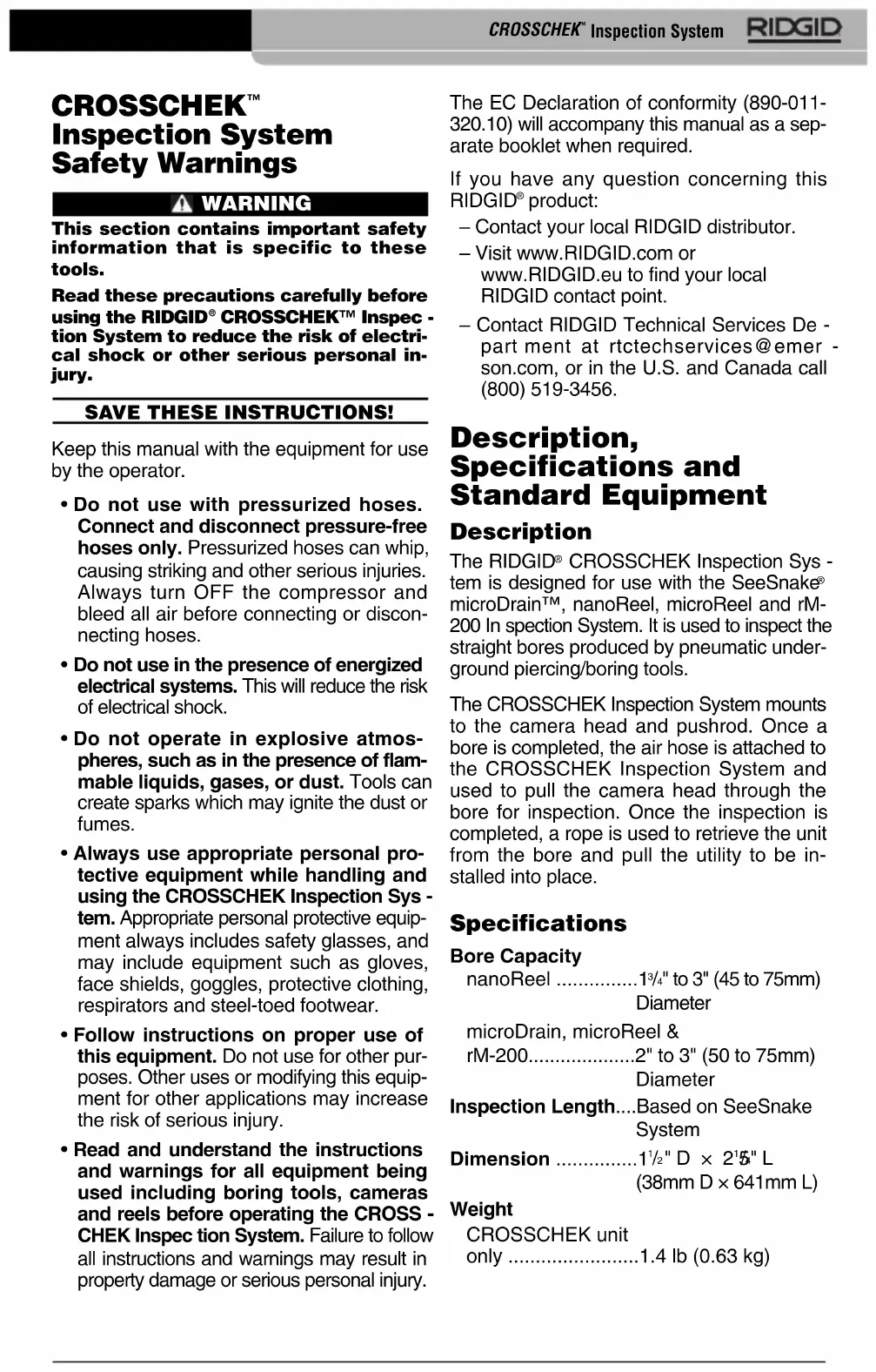 Inspection System The EC Declaration of conformity (890-011- 320.10) will accompany this manual as a sep- arate booklet when required. If you have any question concerning this RIDGID