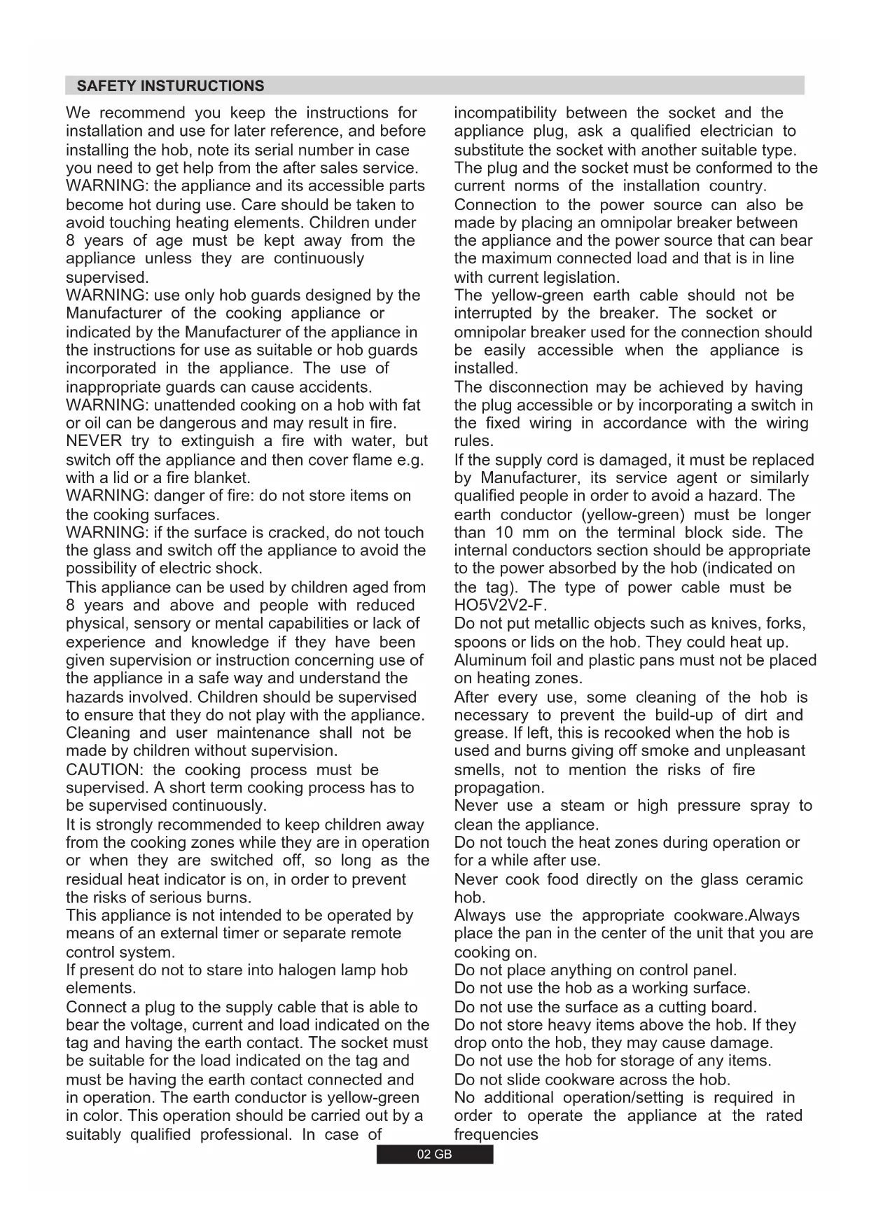 SK 64 012-22 1-7002 GB SAFETY INSTURUCTIONS It is strongly recommended to keep children away from the cooking zones while they are in operation or when they are switched off, so long as the residual heat indicator is on, in order to prevent the risks of serious burns.