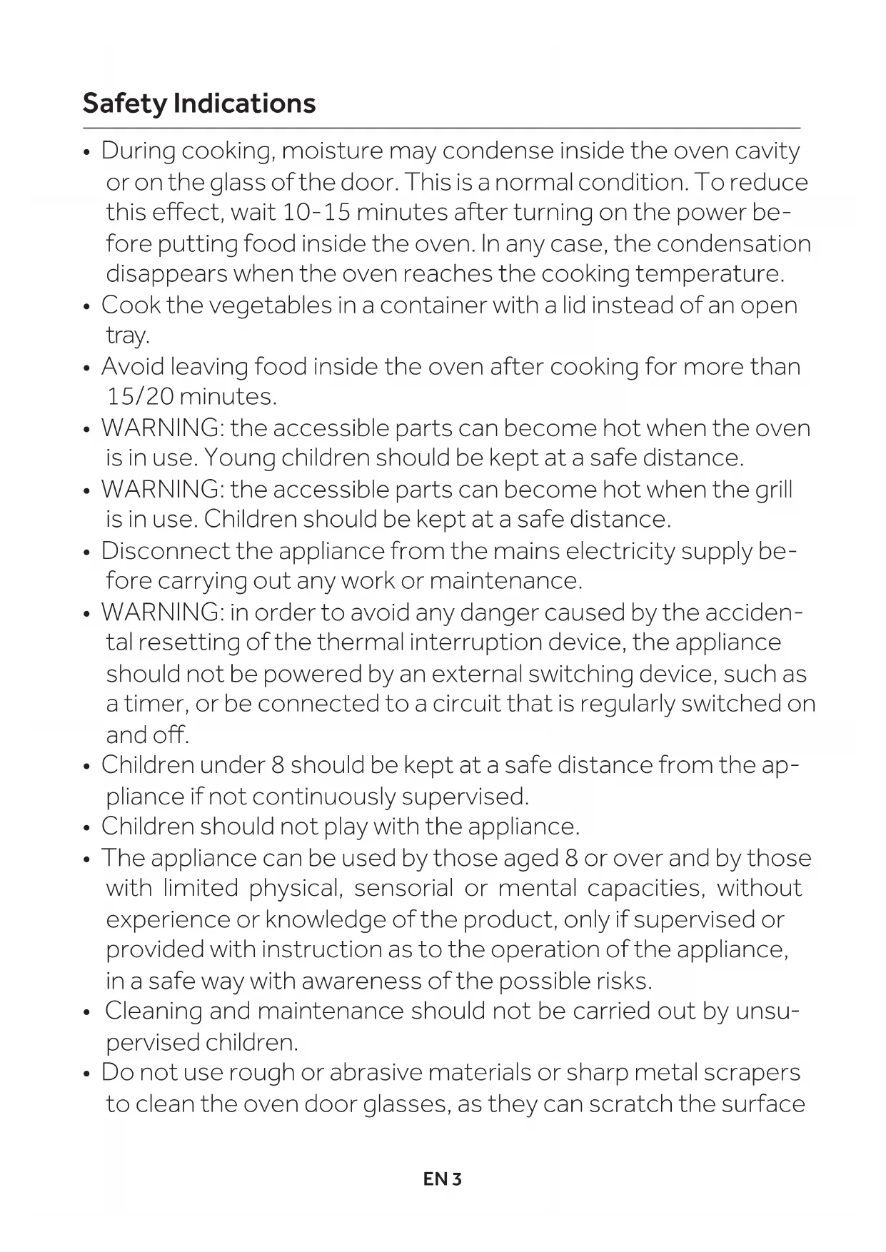 - Do not use rough or abrasive materials or sharp metal scrapers to clean the oven door glasses, as they can scratch the surface Safety IndicationsEN 4 and cause the glass to shatter.