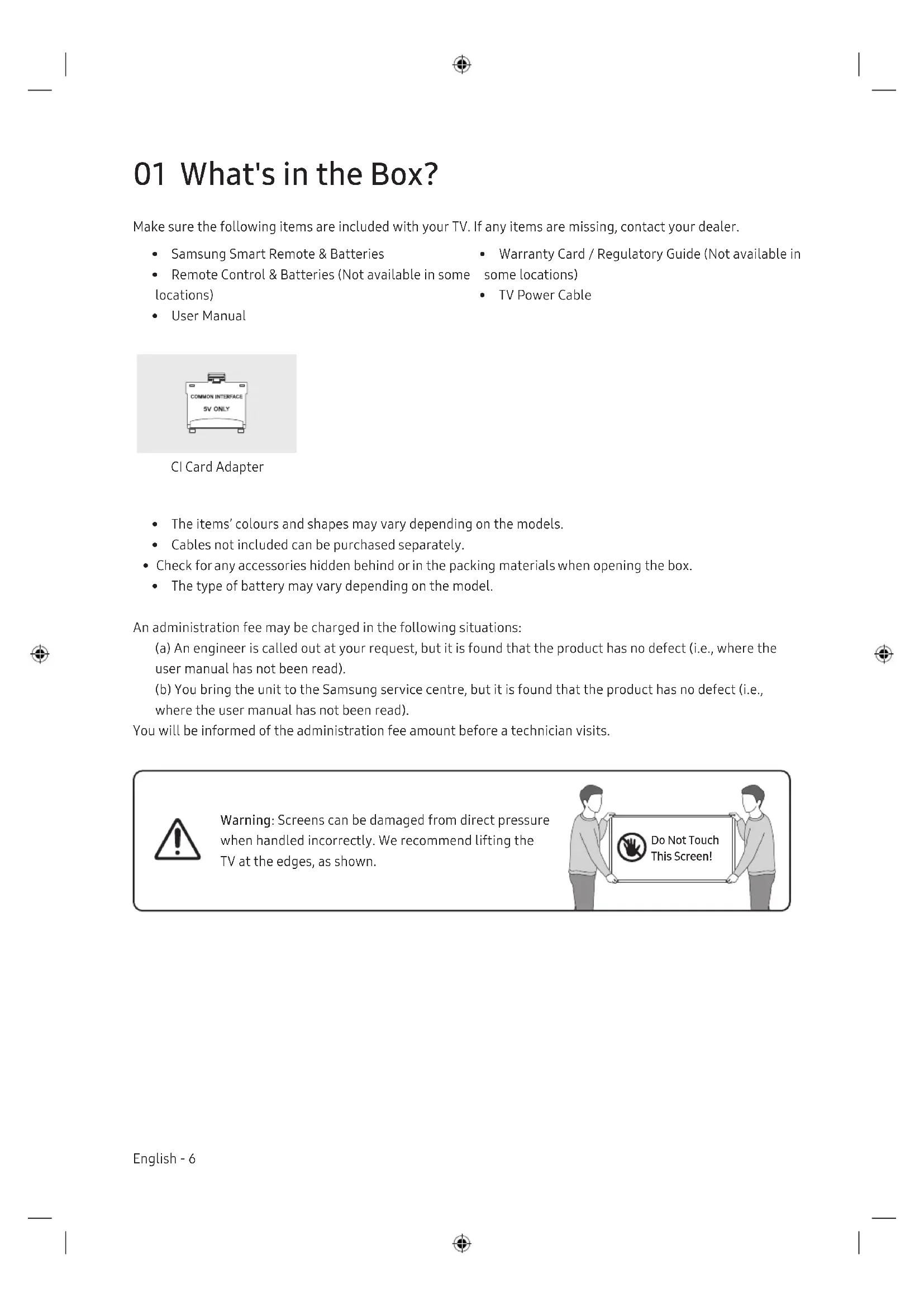 - The type of battery may vary depending on the model. An administration fee may be charged in the following situations: (a) An engineer is called out at your request, but it is found that the product has no defect (i.e., where the user manual has not been read). (b) You bring the unit to the Samsung service centre, but it is found that the product has no defect (i.e., where the user manual has not been read). You will be informed of the administration fee amount before a technician visits.