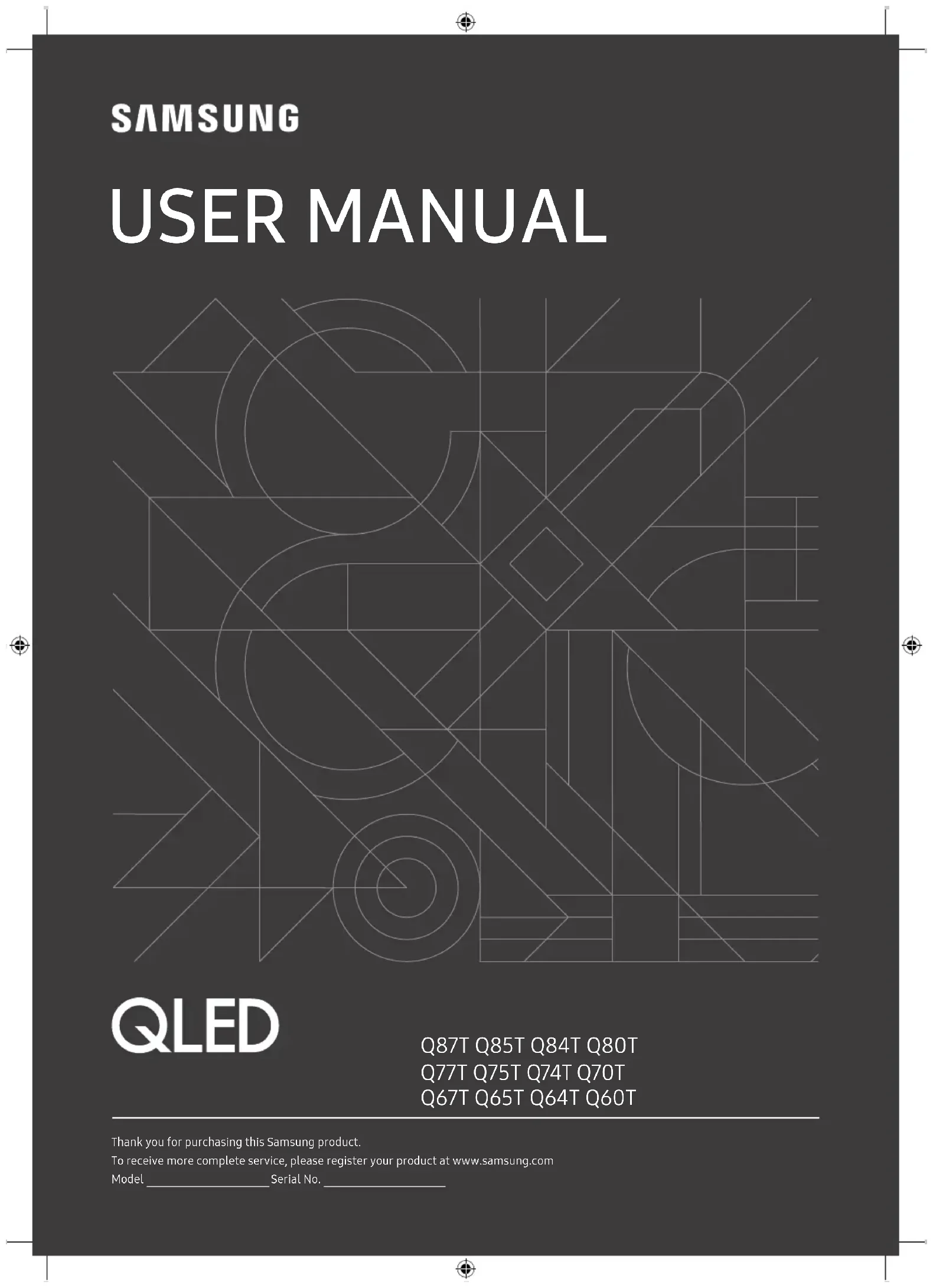Thank you for purchasing this Samsung product. To receive more complete service, please register your product at www.samsung.com Model Serial No. USER MANUAL Q87T Q85T Q84T Q80T Q67T Q65T Q64T Q60T Q77T Q75T Q74T Q70TEnglish - 2 Before Reading This User Manual This TV comes with this user manual and an embedded e-Manual. Before reading this user manual, review the following: User Manual Read this provided user manual to see information about product safety, installation, accessories, initial configuration, and product specifications. e-Manual For more information about this TV, read the e-Manual embedded in the product.