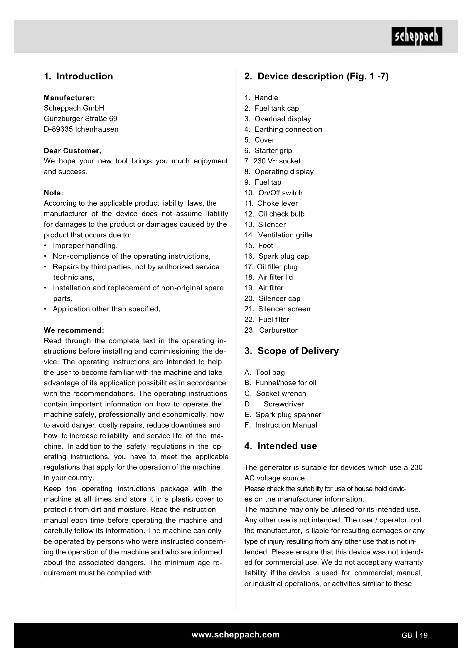 Manufacturer: Scheppach GmbH Günzburger Straße 69 D-89335 Ichenhausen Dear Customer, We hope your new tool brings you much enjoyment and success. Note: According to the applicable product liability laws, the manufacturer of the device does not assume liability for damages to the product or damages caused by the product that occurs due to: