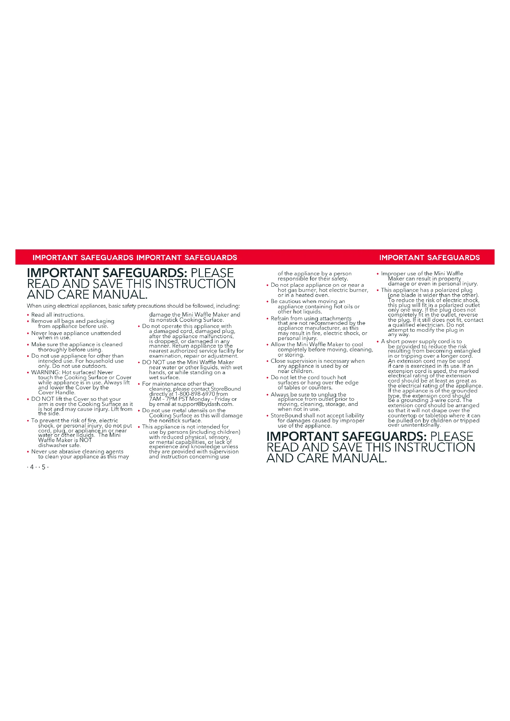 10pm Hey, Hawaii! You can reach our customer service team from 5AM to 5PM. And also, Alaska, feel free to reach out from 6AM to 6PM. feel good guarantee STOREBOUND, LLC – 1 YEAR LIMITED WARRANTYYour StoreBound product is warranted to be free from defects in material and workmanship for a period of one (1) year from the date of the original purchase when utilized for normal and intended household use. Should any defect covered by the terms of the limited warranty be discovered within one (1) year, StoreBound, LLC will repair or replace the defective part. To process a warranty claim, contact Customer Support at 1-800-898-6970 for further assistance and instruction. A Customer Support agent will assist you by troubleshooting minor problems. If troubleshooting fails to x the problem, a return authorization will be issued. Proof of purchase indicating the date and place of purchase is required and should accompany the return. You must also include your full name, shipping address, and telephone number. We are unable to ship returns to a PO box. StoreBound will not be responsible for delays or unprocessed claims resulting from a purchaser’s failure to provide any or all of the necessary information. Freight costs must be prepaid by the purchaser.Send all inquiries to support@bydash.com. There are no express warranties except as listed above.REPAIR OR REPLACEMENT AS PROVIDED UNDER THIS WARRANTY IS THE EXCLUSIVE REMEDY OF THE CUSTOMER. STOREBOUND SHALL NOT BE LIABLE FOR ANY INCIDENTAL OR CONSEQUENTIAL DAMAGES OR FOR BREACH OF ANY EXPRESS OR IMPLIED WARRANTY ON THIS PRODUCT EXCEPT TO THE EXTENT REQUIRED BY APPLICABLE LAW. ANY IMPLIED WARRANTY OF MERCHANTABILITY OR FITNESS FOR A PARTICULAR PURPOSE ON THIS PRODUCT IS LIMITED IN DURATION TO THE DURATION OF THIS WARRANTY.Some states do not allow the exclusion or limitation of incidental or consequential damages, or limitations on how long an implied warranty lasts. Therefore, the above exclusions or limitations may not apply to you. This warranty gives you specic legal rights and you may also have other rights, which vary from state to state.Refurbished items or items not purchased through an authorized retailer are not eligible for warranty claims.REPAIRS DANGER! Risk of electric shock! The Dash Spiderweb Mini Wafe Maker is an electrical appliance. Do not attempt to repair the appliance yourself under any circumstances. Contact Customer Support regarding repairs to the appliance. TECHNICAL SPECIFICATIONSVoltage 120V ~ 60Hz Power Rating 350W Stock#: DMWW001SW_20210415_V2Made in China warranty1-800-898-6970 | @bydash | bydash.com