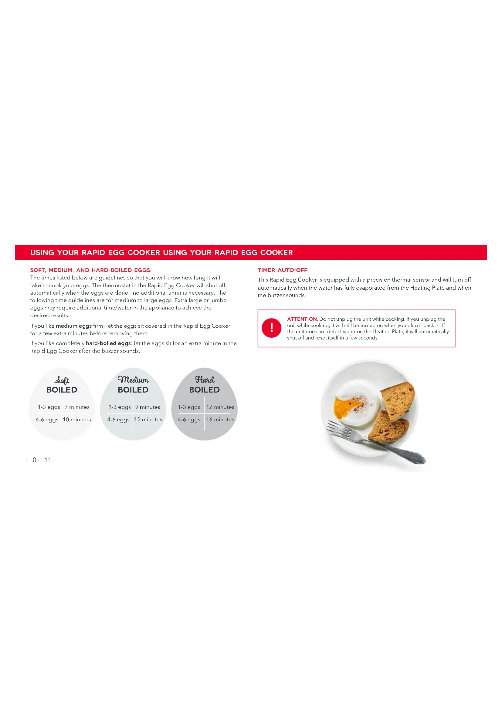 IMPORTANT SAFEGUARDS• Internal base and contents (water and eggs) of Rapid Egg Cooker are hot when in use. Let cool before handling and/or cleaning. • Do not touch the Heating Plate when the Rapid Egg Cooker is hot. Use the handles. • If using a longer power-supply cord or extension cord, make sure that the electrical rating of the wire is compatible with the appliance. If the appliance is of the grounded type, the extension cord should be a grounding-type 3-wire cord. • Use extreme caution when handling the Measuring Cup as it contains a sharp Pin on the bottom of the cup which may cause injury. • Warning! The Lid becomes hot. When eggs are done, carefully remove the Lid by the Cover Handle. Allow the Lid to cool completely before touching or cleaning. • NEVER place the Poaching Tray or Omelette Bowl directly on the Heating Plate. Always place on top of the Boiling Tray. • Make sure the Rapid Egg Cooker is off before removing the eggs. • A short power cord should be used to reduce the risk of tripping and entanglement. • This appliance has a polarized plug (one blade is wider than the other). To reduce the risk of electric shock, this plug will t in a polarized outlet only one way. If the plug does not completely t in the outlet, reverse the plug. If it still does not t, contact a qualied electrician. Do not attempt to modify the plug in any way. • Refrain from using attachments that are not recommended by the appliance manufacturer, as this may result in re, electric shock, or personal injury.• Do not let the power cord touch hot surfaces or hang over the edges of tables or counters.• Unplug the appliance from power outlet and allow to cool when not in use, during assembly/disassembly, and before cleaning the Rapid Egg Cooker. • When cleaning the Body of the appliance, do not submerge in water or other liquids. The Rapid Egg Cooker is NOT dishwasher safe. • Do not place this appliance on or near a hot gas burner, hot electric burner, or in a heated oven. • Do not put your hands or other foreign objects into the Rapid Egg Cooker while it is operating. If food spills onto the Heating Plate, make sure the Rapid Egg Cooker is turned off and cooled before cleaning. • DO NOT place the Lid in the locked position while using the Rapid Egg Cooker as this will increase the risk of injury when removing the Lid once eggs have cooked.• WARNING! Hot steam! Never place your hands or arms over the Steam Hole while the appliance is in use. • Keep hands and utensils away from Heating Plate while cooking eggs to reduce the risk of injury or damage to the Rapid Egg Cooker. ∙ 4 ∙ ∙ 5 ∙∙ 6 ∙ ∙ 7 ∙