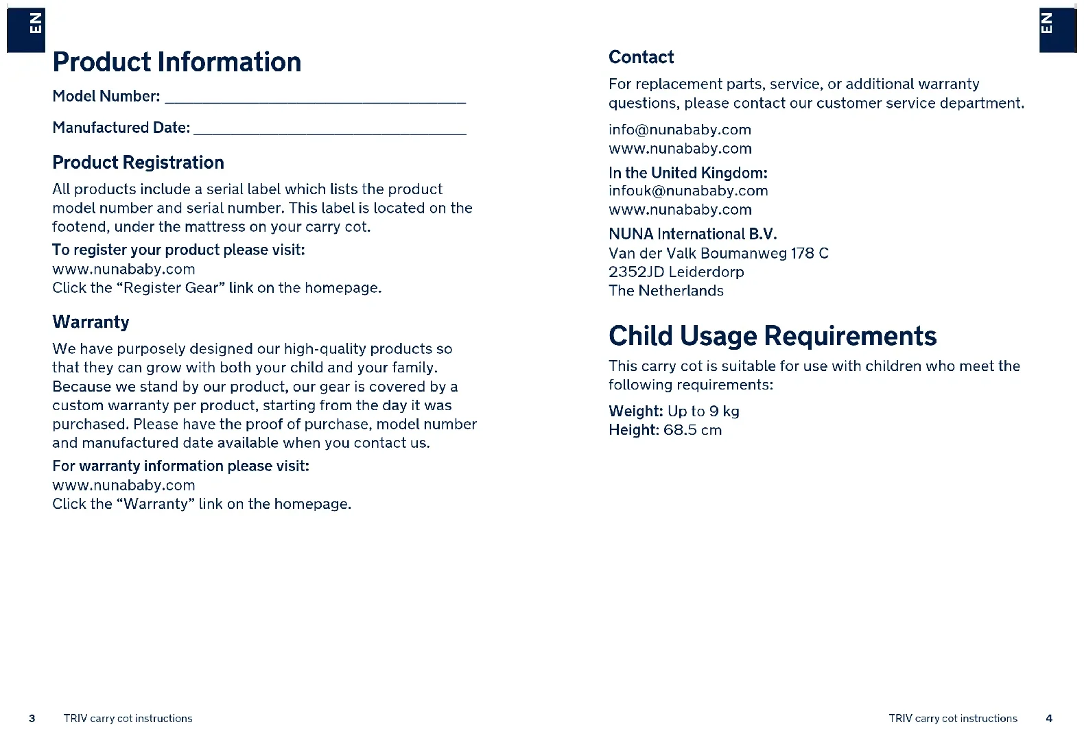 Product Information Model Number: ________________________________ Manufactured Date: _____________________________ Product Registration All products include a serial label which lists the product model number and serial number. This label is located on the footend, under the mattress on your carry cot. To register your product please visit: www.nunababy.com Click the “Register Gear” link on the homepage. Warranty We have purposely designed our high-quality products so that they can grow with both your child and your family. Because we stand by our product, our gear is covered by a custom warranty per product, starting from the day it was purchased. Please have the proof of purchase, model number and manufactured date available when you contact us. For warranty information please visit: www.nunababy.com Click the “Warranty” link on the homepage. Contact For replacement parts, service, or additional warranty questions, please contact our customer service department. info@nunababy.com www.nunababy.com In the United Kingdom: infouk@nunababy.com www.nunababy.com NUNA International B.V. Van der Valk Boumanweg 178 C 2352JD Leiderdorp The Netherlands Child Usage Requirements This carry cot is suitable for use with children who meet the following requirements: Weight: Up to 9 kg Height: 68.5 cm5 TRIV carry cot instructions 6TRIV carry cot instructions