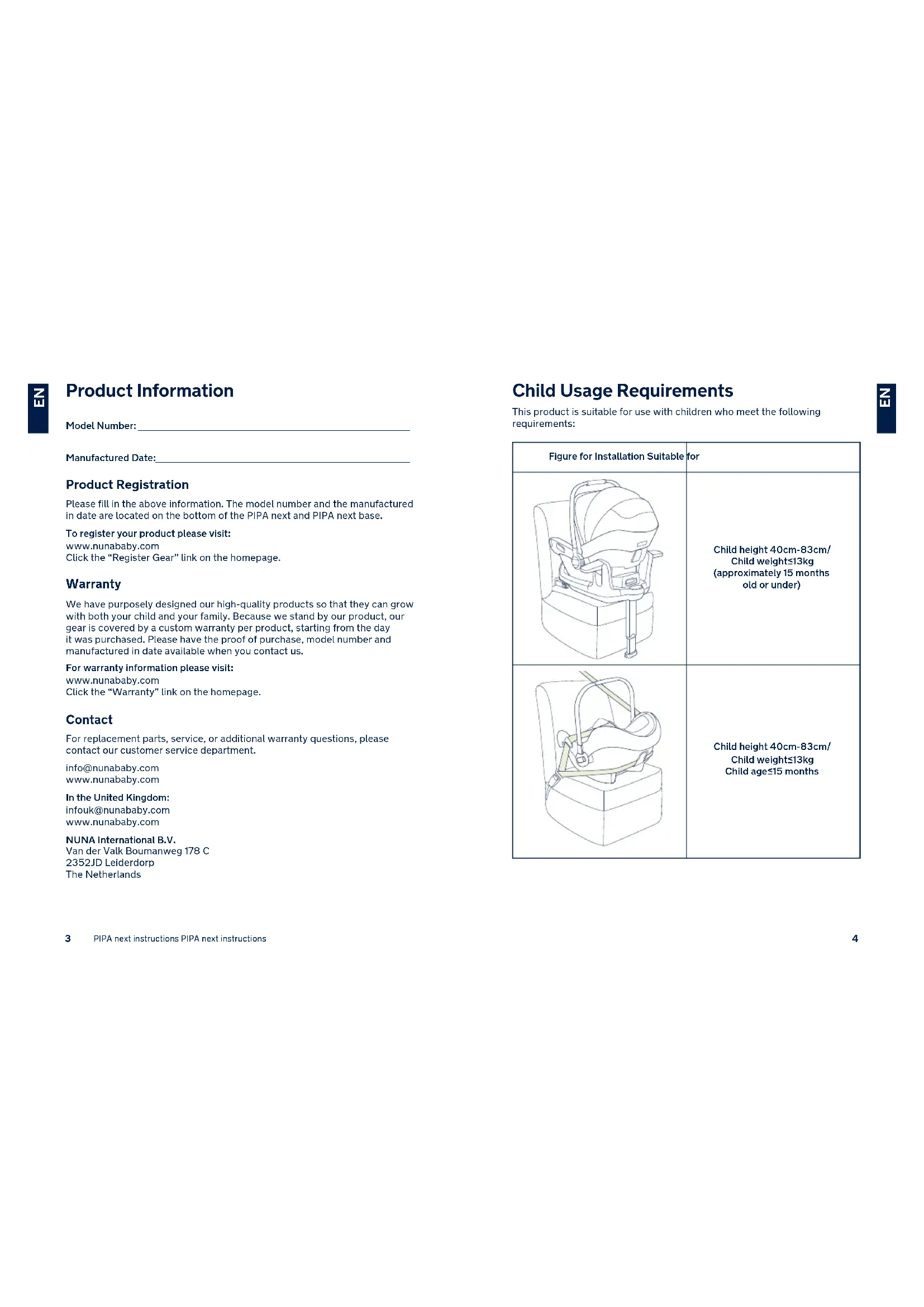 Product Information Model Number: ____________________________________________________________________________________________________________________________ Manufactured Date:____________________________________________________________________________________________________________________ Product Registration Please fill in the above information. The model number and the manufactured in date are located on the bottom of the PIPA next and PIPA next base. To register your product please visit: www.nunababy.com Click the “Register Gear” link on the homepage. Warranty We have purposely designed our high-quality products so that they can grow with both your child and your family. Because we stand by our product, our gear is covered by a custom warranty per product, starting from the day it was purchased. Please have the proof of purchase, model number and manufactured in date available when you contact us. For warranty information please visit: www.nunababy.com Click the “Warranty” link on the homepage. Contact For replacement parts, service, or additional warranty questions, please contact our customer service department. info@nunababy.com www.nunababy.com In the United Kingdom: infouk@nunababy.com www.nunababy.com NUNA International B.V. Van der Valk Boumanweg 178 C 2352JD Leiderdorp The Netherlands Child Usage Requirements This product is suitable for use with children who meet the following requirements: Figure for Installation Suitable for Child height 40cm-83cm/ Child weight≤13kg (approximately 15 months old or under) Child height 40cm-83cm/ Child weight≤13kg Child age≤15 months65 PIPA next instructions PIPA next instructions