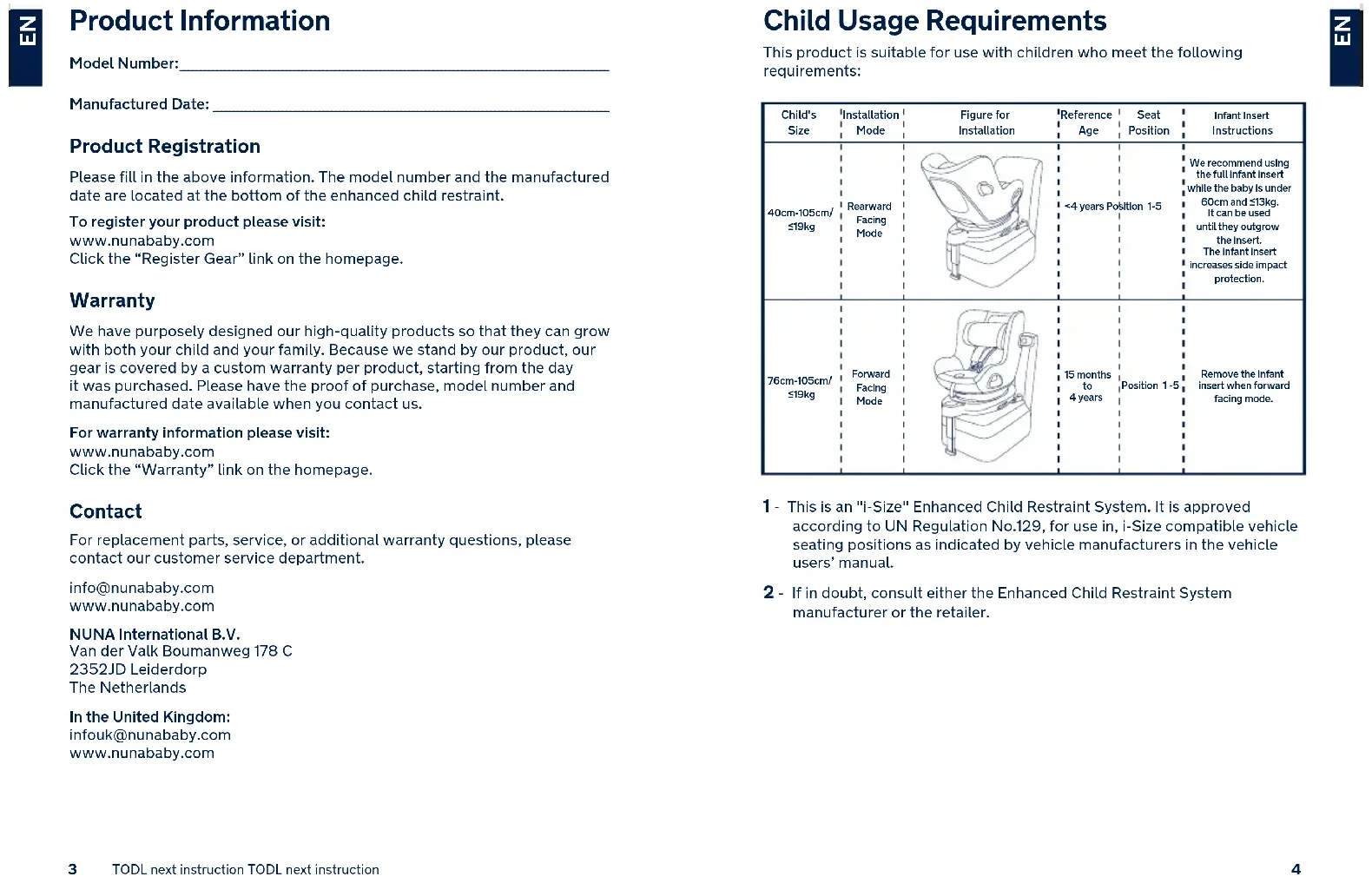 Product Information Model Number: _________________________________________________________________________________________________________ Manufactured Date: _________________________________________________________________________________________________ Product Registration Please fill in the above information. The model number and the manufactured date are located at the bottom of the enhanced child restraint. To register your product please visit: www.nunababy.com Click the “Register Gear” link on the homepage. Warranty We have purposely designed our high-quality products so that they can grow with both your child and your family. Because we stand by our product, our gear is covered by a custom warranty per product, starting from the day it was purchased. Please have the proof of purchase, model number and manufactured date available when you contact us. For warranty information please visit: www.nunababy.com Click the “Warranty” link on the homepage. Contact For replacement parts, service, or additional warranty questions, please contact our customer service department. info@nunababy.com www.nunababy.com NUNA International B.V. Van der Valk Boumanweg 178 C 2352JD Leiderdorp The Netherlands In the United Kingdom: infouk@nunababy.com www.nunababy.com