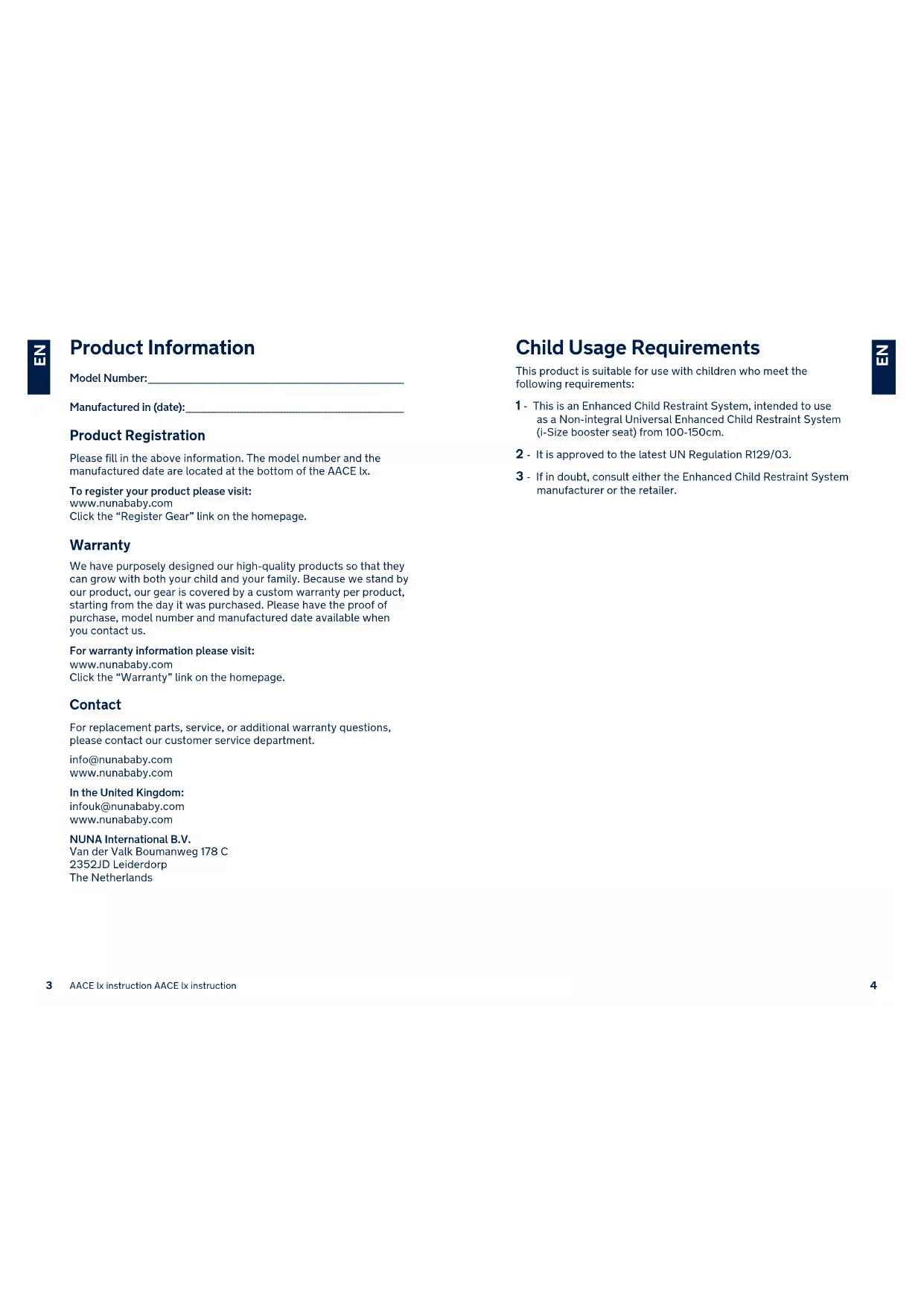 AACE lx instructionProduct Information Model Number: ________________________________________________________________________________________ Manufactured in (date): ___________________________________________________________________________ Product Registration Please fill in the above information. The model number and the manufactured date are located at the bottom of the AACE lx. To register your product please visit: www.nunababy.com Click the “Register Gear” link on the homepage. Warranty We have purposely designed our high-quality products so that they can grow with both your child and your family. Because we stand by our product, our gear is covered by a custom warranty per product, starting from the day it was purchased. Please have the proof of purchase, model number and manufactured date available when you contact us. For warranty information please visit: www.nunababy.com Click the “Warranty” link on the homepage. Contact For replacement parts, service, or additional warranty questions, please contact our customer service department. info@nunababy.com www.nunababy.com In the United Kingdom: infouk@nunababy.com www.nunababy.com NUNA International B.V. Van der Valk Boumanweg 178 C 2352JD Leiderdorp The Netherlands Child Usage Requirements This product is suitable for use with children who meet the following requirements: