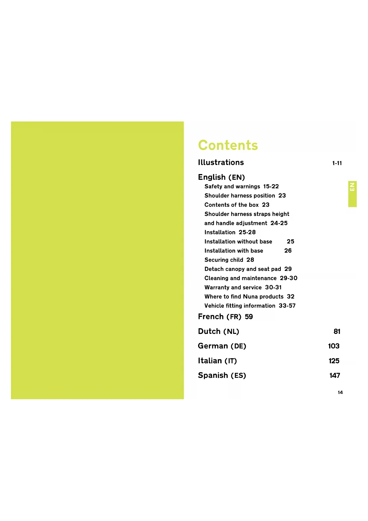 Contents Illustrations 1-11 English (EN) Safety and warnings 15-22 Shoulder harness position 23 Contents of the box 23 Shoulder harness straps height and handle adjustment 24-25 Installation 25-28 Installation without base 25 Installation with base 26 Securing child 28 Detach canopy and seat pad 29 Cleaning and maintenance 29-30 Warranty and service 30-31 Where to find Nuna products 32 Vehicle fitting information 33-57 French (FR) 59 Dutch (NL) 81 German (DE) 103 Italian (IT) 125 Spanish (ES) 1471615