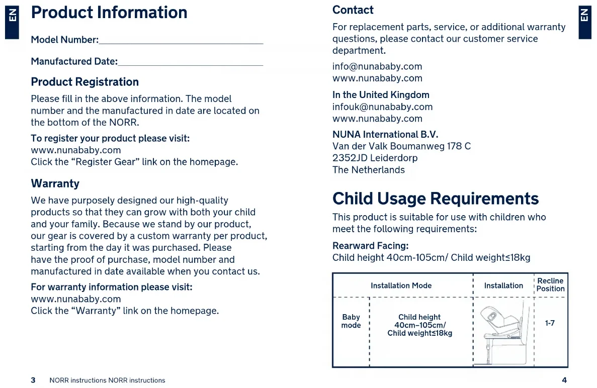 Product Information Model Number:_______________________________________________________________________________________________________________ Manufactured Date: __________________________________________________________________________________________________ Product Registration Please fill in the above information. The model number and the manufactured in date are located on the bottom of the NORR. To register your product please visit: www.nunababy.com Click the “Register Gear” link on the homepage. Warranty We have purposely designed our high-quality products so that they can grow with both your child and your family. Because we stand by our product, our gear is covered by a custom warranty per product, starting from the day it was purchased. Please have the proof of purchase, model number and manufactured in date available when you contact us. For warranty information please visit: www.nunababy.com Click the “Warranty” link on the homepage. Contact For replacement parts, service, or additional warranty questions, please contact our customer service department. info@nunababy.com www.nunababy.com In the United Kingdom infouk@nunababy.com www.nunababy.com NUNA International B.V. Van der Valk Boumanweg 178 C 2352JD Leiderdorp The Netherlands Child Usage Requirements This product is suitable for use with children who meet the following requirements: Rearward Facing: Child height 40cm-105cm/ Child weight≤18kg Installation Mode Baby mode Child height 40cm–105cm/ Child weight≤18kg Installation Recline Position 1-765 NORR instructions NORR instructions