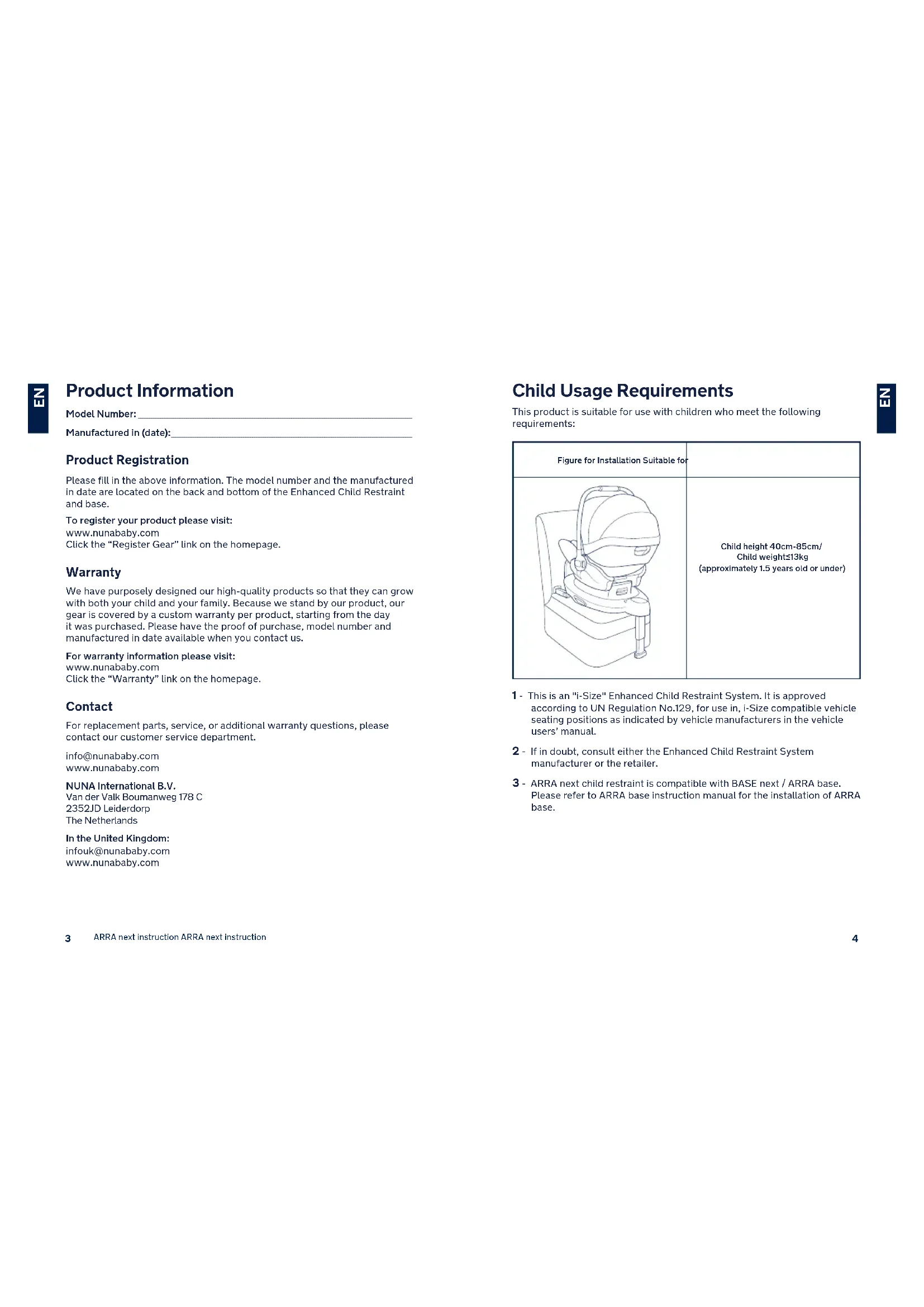 Child Usage Requirements This product is suitable for use with children who meet the following requirements: Figure for Installation Suitable forChild height 40cm-85cm/Child weight≤13kg(approximately 1.5 years old or under) Product Information Model Number: _____________________________________________________________________________________________________________________________ Manufactured in (date): ______________________________________________________________________________________________________________ Product Registration Please fill in the above information. The model number and the manufactured in date are located on the back and bottom of the Enhanced Child Restraint and base. To register your product please visit: www.nunababy.com Click the “Register Gear” link on the homepage. Warranty We have purposely designed our high-quality products so that they can grow with both your child and your family. Because we stand by our product, our gear is covered by a custom warranty per product, starting from the day it was purchased. Please have the proof of purchase, model number and manufactured in date available when you contact us. For warranty information please visit: www.nunababy.com Click the “Warranty” link on the homepage. Contact For replacement parts, service, or additional warranty questions, please contact our customer service department. info@nunababy.com www.nunababy.com NUNA International B.V. Van der Valk Boumanweg 178 C 2352JD Leiderdorp The Netherlands In the United Kingdom: infouk@nunababy.com www.nunababy.com