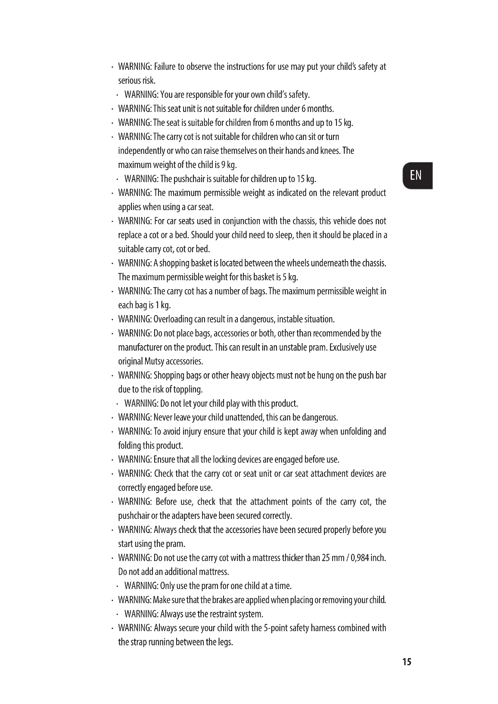 - WARNING: The pushchair is suitable for children up to 15 kg.