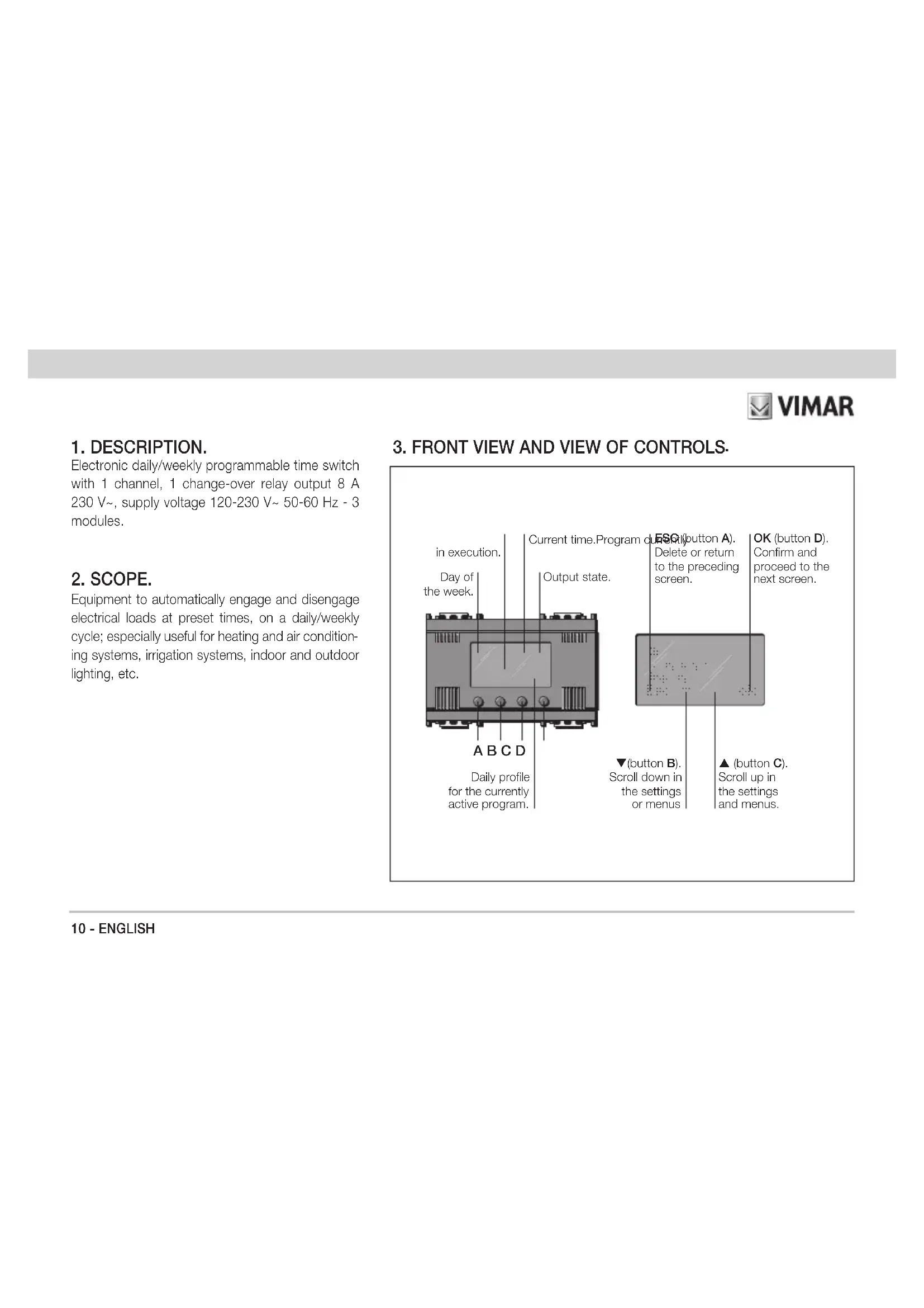 ing systems, irrigation systems, indoor and outdoor lighting, etc. A B C D Daily profile for the currently active program. Day of the week. Current time.Program currently in execution. Output state. OK (button D). Confirm and proceed to the next screen. ESC (button A). Delete or return to the preceding screen. (button B). Scroll down in the settings or menus (button C). Scroll up in the settings and menus.ENGLISH - 11