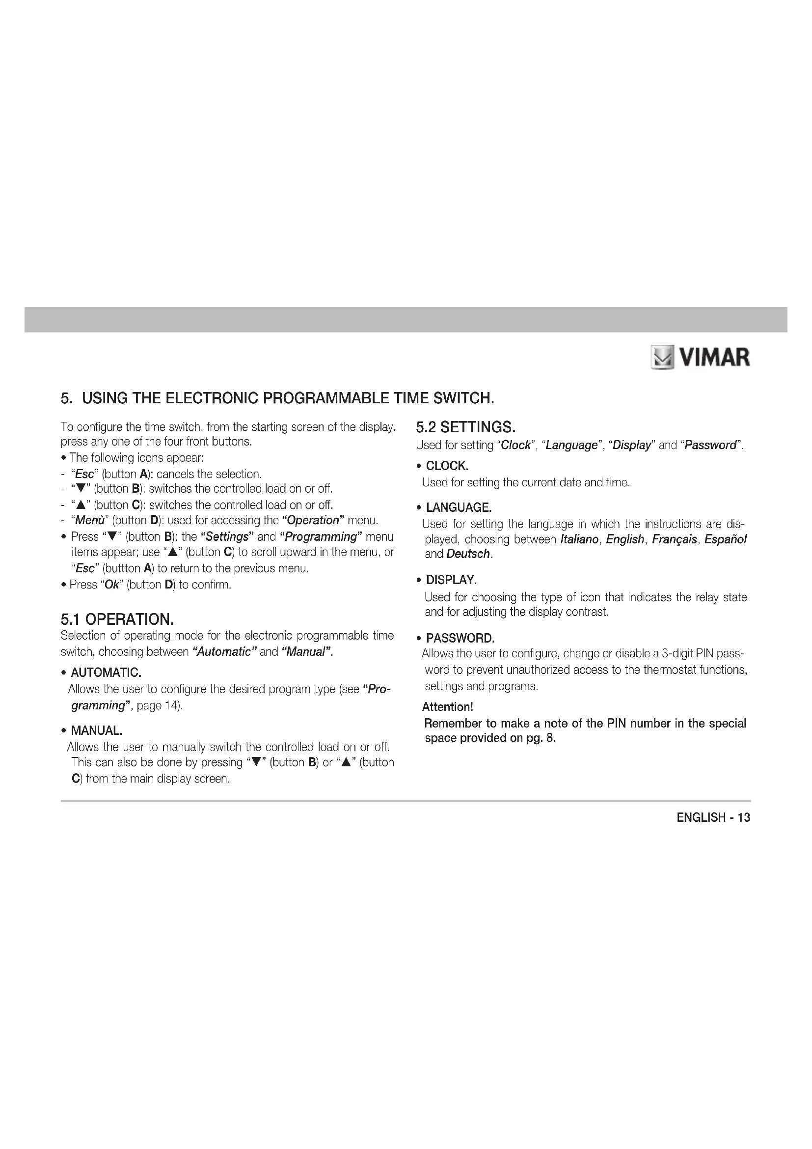 - PASSWORD. Allows the user to configure, change or disable a 3-digit PIN pass- word to prevent unauthorized access to the thermostat functions, settings and programs. Attention! Remember to make a note of the PIN number in the special space provided on pg. 8.14 - ENGLISH