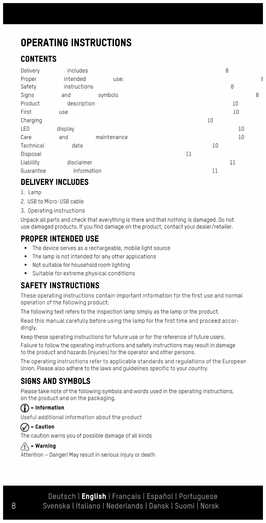 Please take note of the following symbols and words used in the operating instructions, on the product and on the packaging. = Information Useful additional information about the product = Caution The caution warns you of possible damage of all kinds = Warning Attention – Danger! May result in serious injury or death Delivery includes 8 Proper intended use: 8 Safety instructions 8 Signs and symbols 8 Product description 10 First use 10 Charging 10 LED display 10 Care and maintenance 10 Technical data 10 Disposal 11 Liability disclaimer 11 Guarantee information 11 Deutsch | English | Français | Español | Portuguese Svenska | Italiano | Nederlands | Dansk | Suomi | Norsk Deutsch | English | Français | Español | Portuguese Svenska | Italiano | Nederlands | Dansk | Suomi | Norsk9 OBSERVE SAFETY INSTRUCTIONS! Avoid eye injuries - Never look directly into the beam of light or shine it into other people‘s faces. If this occurs for too long, the blue light portion of the beam can cause retinal damage. If the light beam shines into the eyes, close the eyes and turn the head away from the light beam. This lamp exceeds the conditions for risk-free use. The risk when using it depends on how the user handles the lamp. (1) This value indicates the factor by which the risk group limit value to the next lowest group has been exceeded. The limit value is 1. (2) Distance from eyes to the lamp at which the respective risk group is applicable. Risk group 2 Gefahrenwert der Exposition / Exposure Hazard Value (EHV) (1) : 12 Risikogruppe Gefährdungsabstand / Hazard Distance (HD) (2) 2 0m bis 0,7m 1 0,7m bis 7m Free group > 7m § Information for the light, mains adapter and mains voltage on the socket must match with the type plate. § Do not use the product if there is damage to the housing, plug, cable or mains adapter. Contact your local authorised specialist or the service address of the manufacturer. § Do not open or modify the product! Repair work and replacement of the rechargeable battery pack shall only be carried out by the manufacturer or by a service technician appointed by the manufacturer or by a similarly qualified person. § Keep the product and the packaging away from children. This product is not a toy. Children should be supervised in order to ensure that they do not play with the product. § This product is not to be used by persons (including children) who have restricted physical, sensory or mental capabilities or who do not have adequate experien- ce and knowledge in handling this product. Such persons must be instructed beforehand by a supervisory person who is responsible for their safety or must be supervised during the use of the product! § The LED light source cannot be replaced. When the LED comes to the end of its service life, the complete lamp must be replaced § All illuminated objects must be at least 10cm away from the light! § The lamp may only be used in accordance with the intended use. § This product is not a toy to be played with. § Keep out of the reach of children! § Failure to observe the safety instructions can result in dangerous injuries to per- sons or damage to the device! § Always keep the product dry ATTENTION: § The product contains a non-replaceable li-ion rechargeable battery. Do not throw the product into a fire! § The product may only be charged in closed, dry and spacious rooms, away from com- bustible materials and liquids. Disregard can result in burns and fires. § Never open, crush or heat a rechargeable battery or set it on fire. § Do not use the product in potentially explosive areas or in the rain and do not expose it to excessive heat. § Do not use the product if it appears to be damaged Deutsch | English | Français | Español | Portuguese Svenska | Italiano | Nederlands | Dansk | Suomi | Norsk10 PRODUCT DESCRIPTION:
