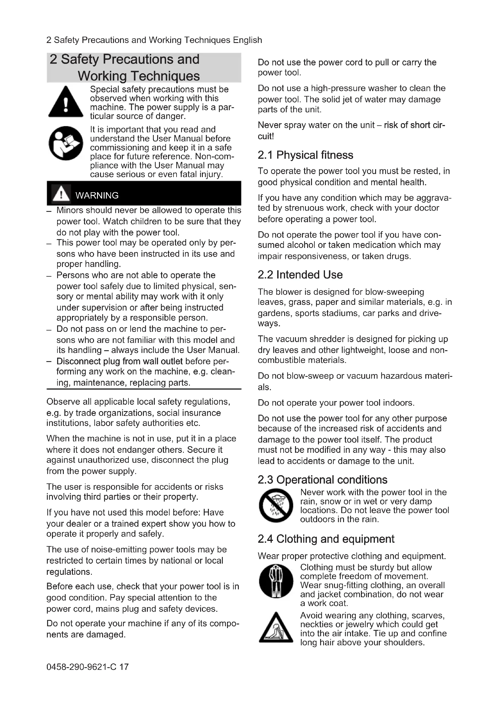 Risk of injury from contact with rotating blower wheel. Risk of injury from contact with rotating blower wheel. Always switch off the motor and disconnect the plug from the power supply before removing the intake screen, suction tube, blower tube or