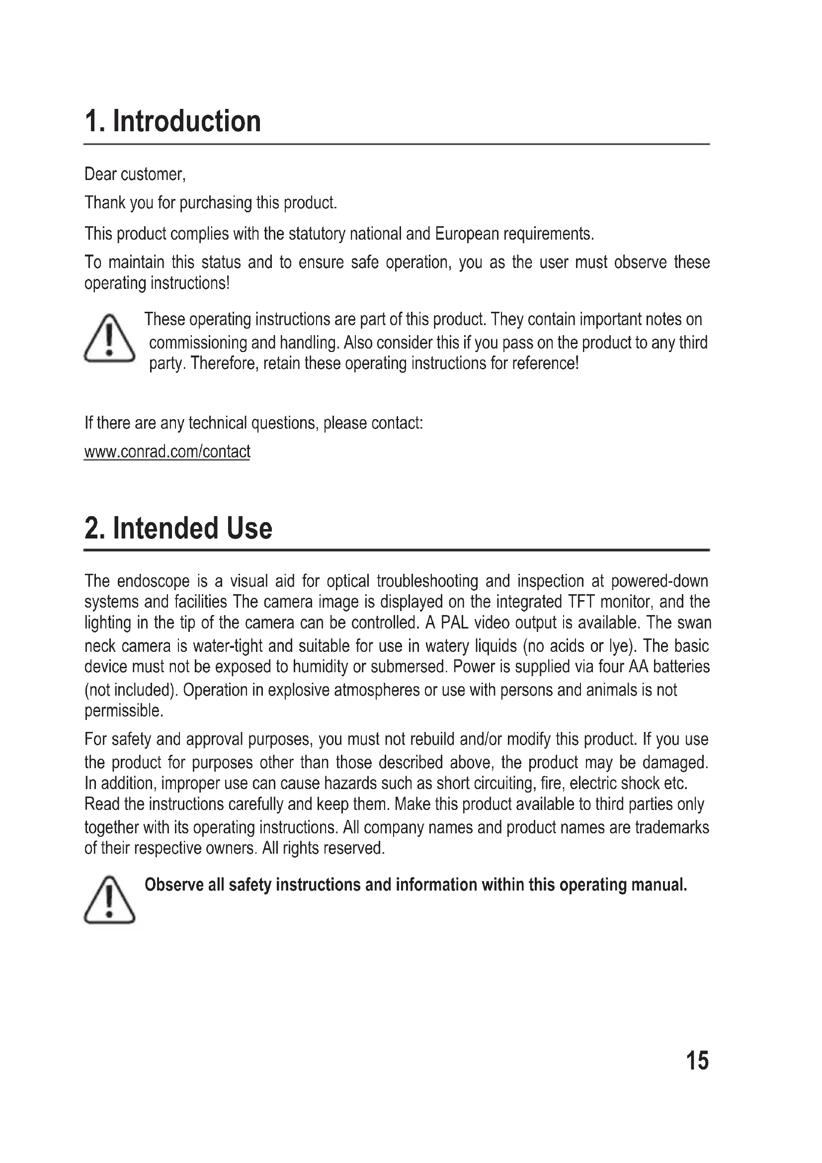 The endoscope is a visual aid for optical troubleshooting and inspection at powered-down systems and facilities The camera image is displayed on the integrated TFT monitor, and the lighting in the tip of the camera can be controlled. A PAL video output is available. The swan neck camera is water-tight and suitable for use in watery liquids (no acids or lye). The basic device must not be exposed to humidity or submersed. Power is supplied via four AA batteries (notincluded).Operationinexplosiveatmospheresorusewithpersonsandanimalsisnot permissible. For safety and approval purposes, you must not rebuild and/or modify this product. If you use the product for purposes other than those described above, the product may be damaged. Inaddition,improperusecancausehazardssuchasshortcircuiting,re,electricshocketc. Readtheinstructionscarefullyandkeepthem.Makethisproductavailabletothirdpartiesonly together with its operating instructions. All company names and product names are trademarks of their respective owners. All rights reserved. Observe all safety instructions and information within this operating manual.