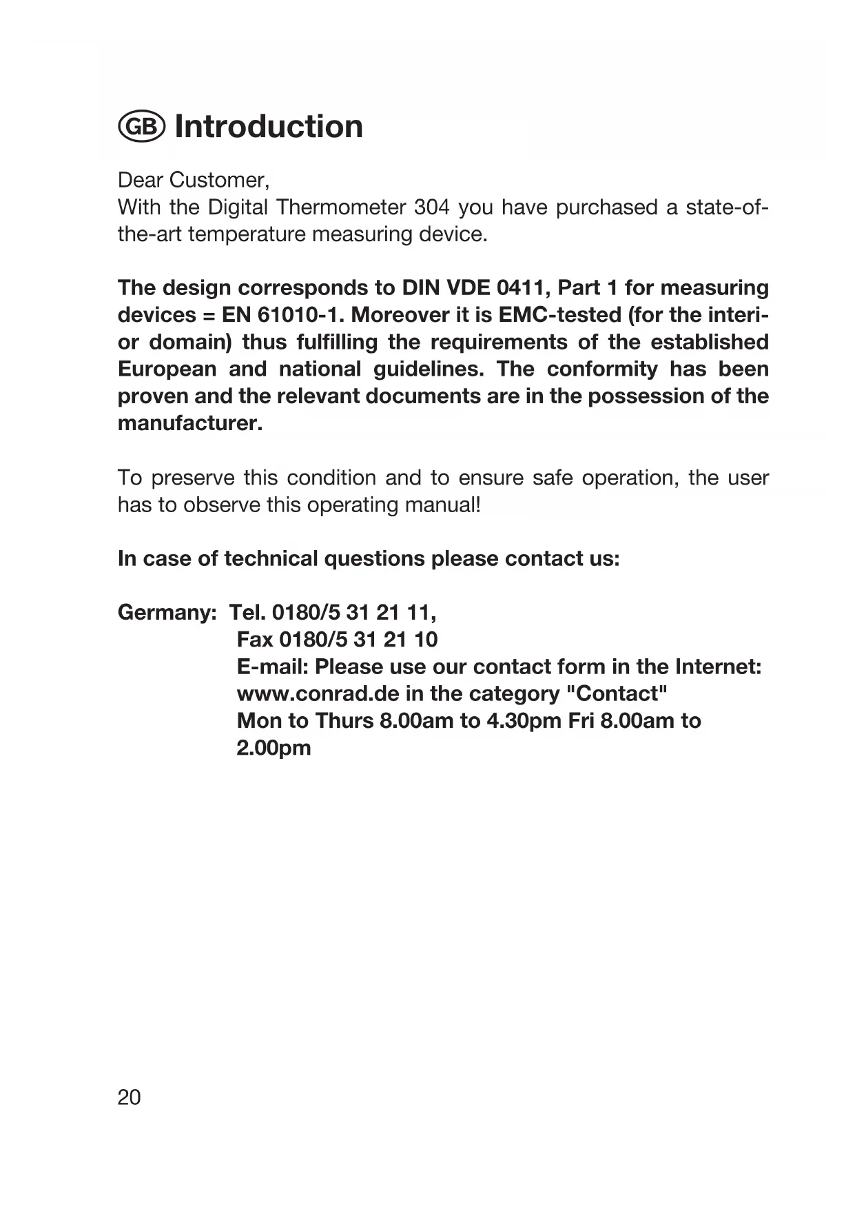 Introduction Dear Customer, With the Digital Thermometer 304 you have purchased a state-of- the-art temperature measuring device. The design corresponds to DIN VDE 0411, Part 1 for measuring devices = EN 61010-1. Moreover it is EMC-tested (for the interi- or domain) thus fulfilling the requirements of the established European and national guidelines. The conformity has been proven and the relevant documents are in the possession of the manufacturer. To preserve this condition and to ensure safe operation, the user has to observe this operating manual! In case of technical questions please contact us: Germany: Tel. 0180/5 31 21 11, Fax 0180/5 31 21 10 E-mail: Please use our contact form in the Internet: www.conrad.de in the category "Contact" Mon to Thurs 8.00am to 4.30pm Fri 8.00am to 2.00pm 20Prescribed Use Measurements of temperatures within the range of -200°C to +1370°C and –328°F to +2498°F resp. by means of one or two up to four (independent) external temperature sensor(s) (K-type). Measurements of temperatures within the range of –50°C to a maxi- mum of +200°C and –58°F to +392°F resp. by means of the two enclosed K-type temperature sensors. Signal transmission bi-directionally to an IBM-compatible PC with Windows ’98 or higher via the serial interface. A measurement under unfavourable ambient conditions is not admis- sible. Unfavourable ambient conditions are: - wetness or too high air humidity, - dust and inflammable gases, fumes or solvents, - thunderstorms or thunderstorm-like conditions as strong elec- trostatic fields etc. A use different to the one described above damages the measuring instrument. Moreover, this involves dangers, such as e.g. short-cir- cuit, burning, electric shock etc. No part of the product may be modified or rebuilt! The safety instructions must be strictly observed! 21Controls Illustration (fold-out page)