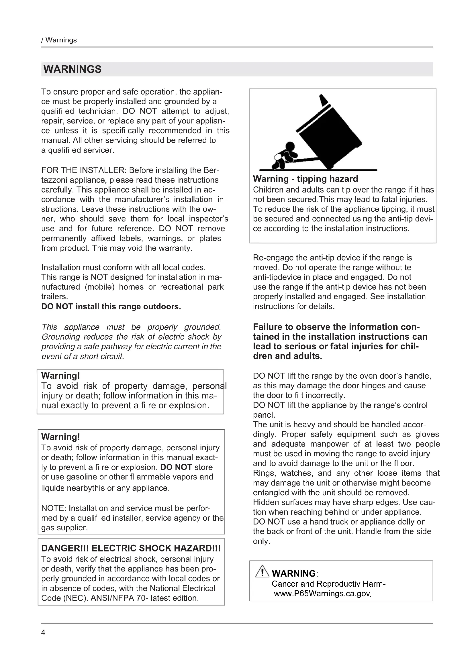 / Models Models MAST365INMXE MAST365INSXT Models PROF304INMXE PROF304INMXT PROF304INSART PROF304INSBIT PROF304INSGIT PROF304INSNET PROF304INSROT PROF304INSXT PROF365INSART PROF365INSBIT PROF365INSGIT PROF365INSNET PROF365INSROT PROF365INSXT4 / Warnings WARNINGS To ensure proper and safe operation, the applian- ce must be properly installed and grounded by a qualifi ed technician. DO NOT attempt to adjust, repair, service, or replace any part of your applian- ce unless it is specifi cally recommended in this manual. All other servicing should be referred to a qualifi ed servicer. FOR THE INSTALLER: Before installing the Ber- tazzoni appliance, please read these instructions carefully. This appliance shall be installed in ac- cordance with the manufacturer’s installation in- structions. Leave these instructions with the ow- ner, who should save them for local inspector’s use and for future reference. DO NOT remove permanently affi xed labels, warnings, or plates from product. This may void the warranty. Installation must conform with all local codes. This range is NOT designed for installation in ma- nufactured (mobile) homes or recreational park trailers. DO NOT install this range outdoors. This appliance must be properly grounded. Grounding reduces the risk of electric shock by providing a safe pathway for electric current in the event of a short circuit. Warning! To avoid risk of property damage, personal injury or death; follow information in this ma- nual exactly to prevent a fi re or explosion. Warning! To avoid risk of property damage, personal injury or death; follow information in this manual exact- ly to prevent a fi re or explosion. DO NOT store or use gasoline or other fl ammable vapors and liquids nearbythis or any appliance. NOTE: Installation and service must be perfor- med by a qualifi ed installer, service agency or the gas supplier. DANGER!!! ELECTRIC SHOCK HAZARD!!! To avoid risk of electrical shock, personal injury or death, verify that the appliance has been pro- perly grounded in accordance with local codes or in absence of codes, with the National Electrical Code (NEC). ANSI/NFPA 70- latest edition. Warning - tipping hazard Children and adults can tip over the range if it has not been secured.This may lead to fatal injuries. To reduce the risk of the appliance tipping, it must be secured and connected using the anti-tip devi- ce according to the installation instructions. Re-engage the anti-tip device if the range is moved. Do not operate the range without te anti-tipdevice in place and engaged. Do not use the range if the anti-tip device has not been properly installed and engaged. See installation instructions for details. Failure to observe the information con- tained in the installation instructions can lead to serious or fatal injuries for chil- dren and adults. DO NOT lift the range by the oven door’s handle, as this may damage the door hinges and cause the door to fi t incorrectly. DO NOT lift the appliance by the range’s control panel. The unit is heavy and should be handled accor- dingly. Proper safety equipment such as gloves and adequate manpower of at least two people must be used in moving the range to avoid injury and to avoid damage to the unit or the fl oor. Rings, watches, and any other loose items that may damage the unit or otherwise might become entangled with the unit should be removed. Hidden surfaces may have sharp edges. Use cau- tion when reaching behind or under appliance. DO NOT use a hand truck or appliance dolly on the back or front of the unit. Handle from the side only.