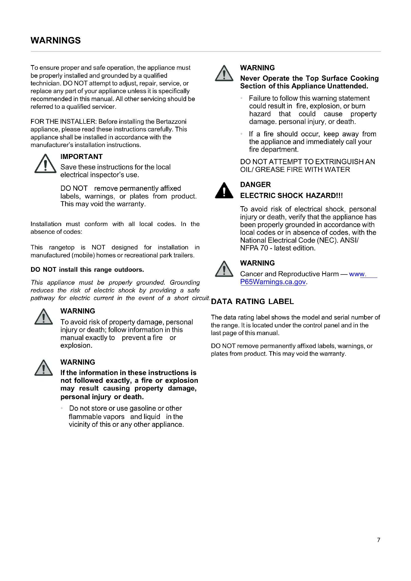 DANGER ELECTRIC SHOCK HAZARD!!! To avoid risk of electrical shock, personal injury or death, verify that the appliance has been properly grounded in accordance with local codes or in absence of codes, with the National Electrical Code (NEC). ANSI/ NFPA 70 - latest edition. WARNING Cancer and Reproductive Harm — www. P65Warnings.ca.gov.