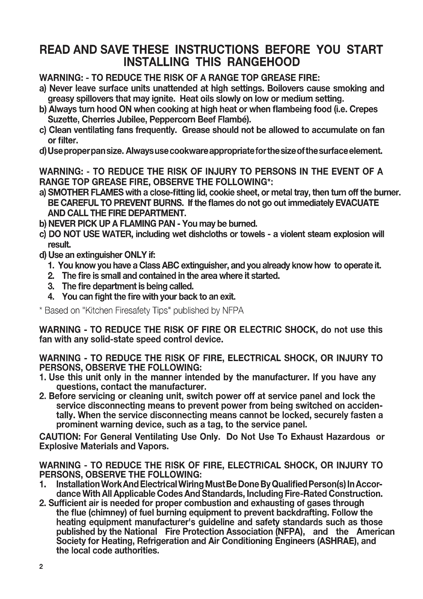 - Based on "Kitchen Firesafety Tips" published by NFPA WARNING - TO REDUCE THE RISK OF FIRE OR ELECTRIC SHOCK, do not use this fan with any solid-state speed control device. WARNING - TO REDUCE THE RISK OF FIRE, ELECTRICAL SHOCK, OR INJURY TO PERSONS, OBSERVE THE FOLLOWING: