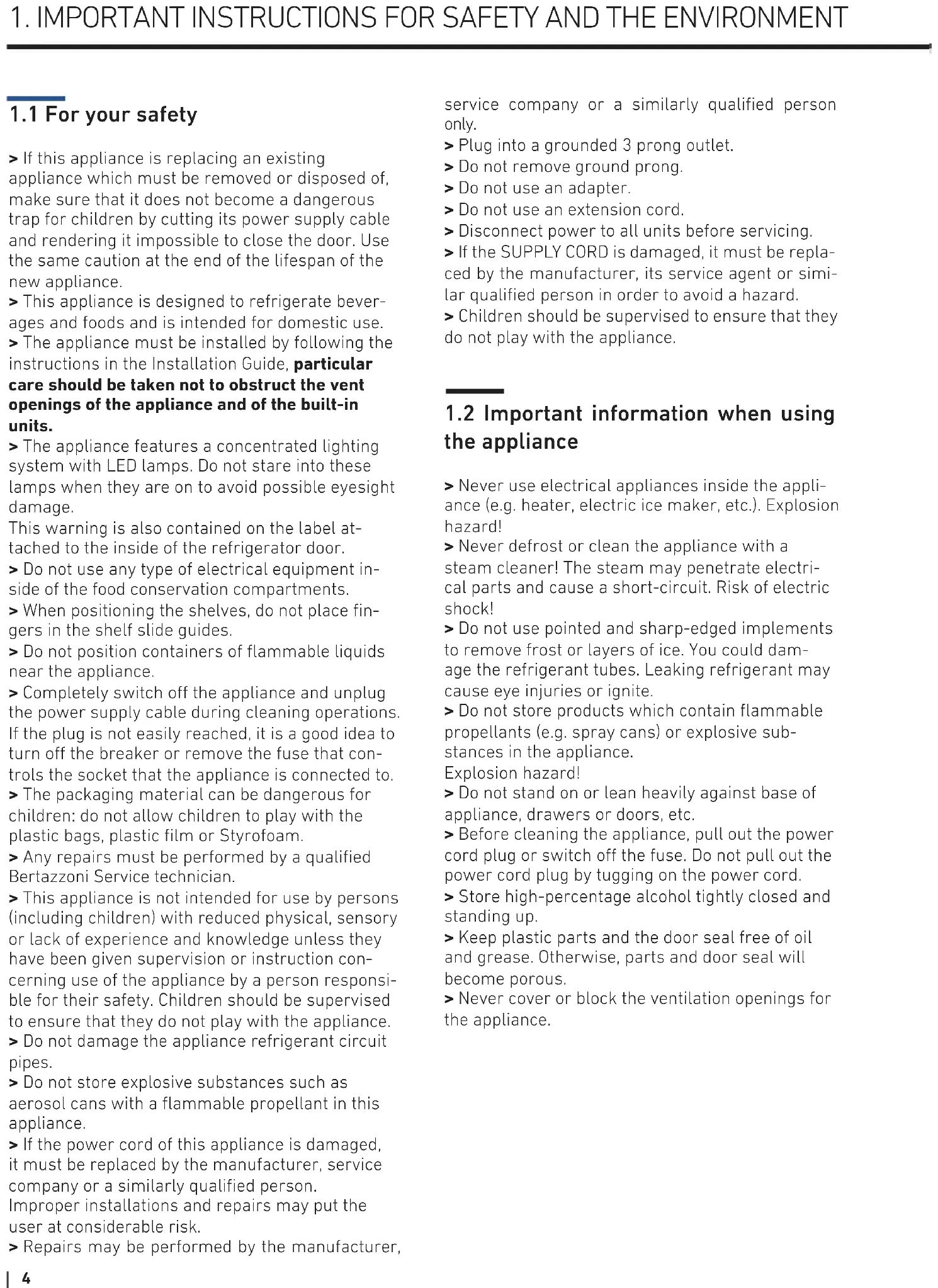 > If this appliance is replacing an existing appliance which must be removed or disposed of, make sure that it does not become a dangerous trap for children by cutting its power supply cable and rendering it impossible to close the door. Use the same caution at the end of the lifespan of the new appliance. > This appliance is designed to refrigerate bever- ages and foods and is intended for domestic use. > The appliance must be installed by following the instructions in the Installation Guide, particular care should be taken not to obstruct the vent openings of the appliance and of the built-in units. > The appliance features a concentrated lighting system with LED lamps. Do not stare into these lamps when they are on to avoid possible eyesight damage. This warning is also contained on the label at- tached to the inside of the refrigerator door. > Do not use any type of electrical equipment in- side of the food conservation compartments. > When positioning the shelves, do not place fin- gers in the shelf slide guides. > Do not position containers of flammable liquids near the appliance. > Completely switch o the appliance and unplug the power supply cable during cleaning operations. If the plug is not easily reached, it is a good idea to turn o the breaker or remove the fuse that con- trols the socket that the appliance is connected to. > The packaging material can be dangerous for children: do not allow children to play with the plastic bags, plastic film or Styrofoam. > Any repairs must be performed by a qualified Bertazzoni Service technician. > This appliance is not intended for use by persons (including children) with reduced physical, sensory or lack of experience and knowledge unless they have been given supervision or instruction con- cerning use of the appliance by a person responsi- ble for their safety. Children should be supervised to ensure that they do not play with the appliance. > Do not damage the appliance refrigerant circuit pipes. > Do not store explosive substances such as aerosol cans with a flammable propellant in this appliance. > If the power cord of this appliance is damaged, it must be replaced by the manufacturer, service company or a similarly qualified person. Improper installations and repairs may put the user at considerable risk. > Repairs may be performed by the manufacturer, service company or a similarly qualified person only. > Plug into a grounded 3 prong outlet. > Do not remove ground prong. > Do not use an adapter. > Do not use an extension cord. > Disconnect power to all units before servicing. > If the SUPPLY CORD is damaged, it must be repla- ced by the manufacturer, its service agent or simi- lar qualified person in order to avoid a hazard. > Children should be supervised to ensure that they do not play with the appliance.