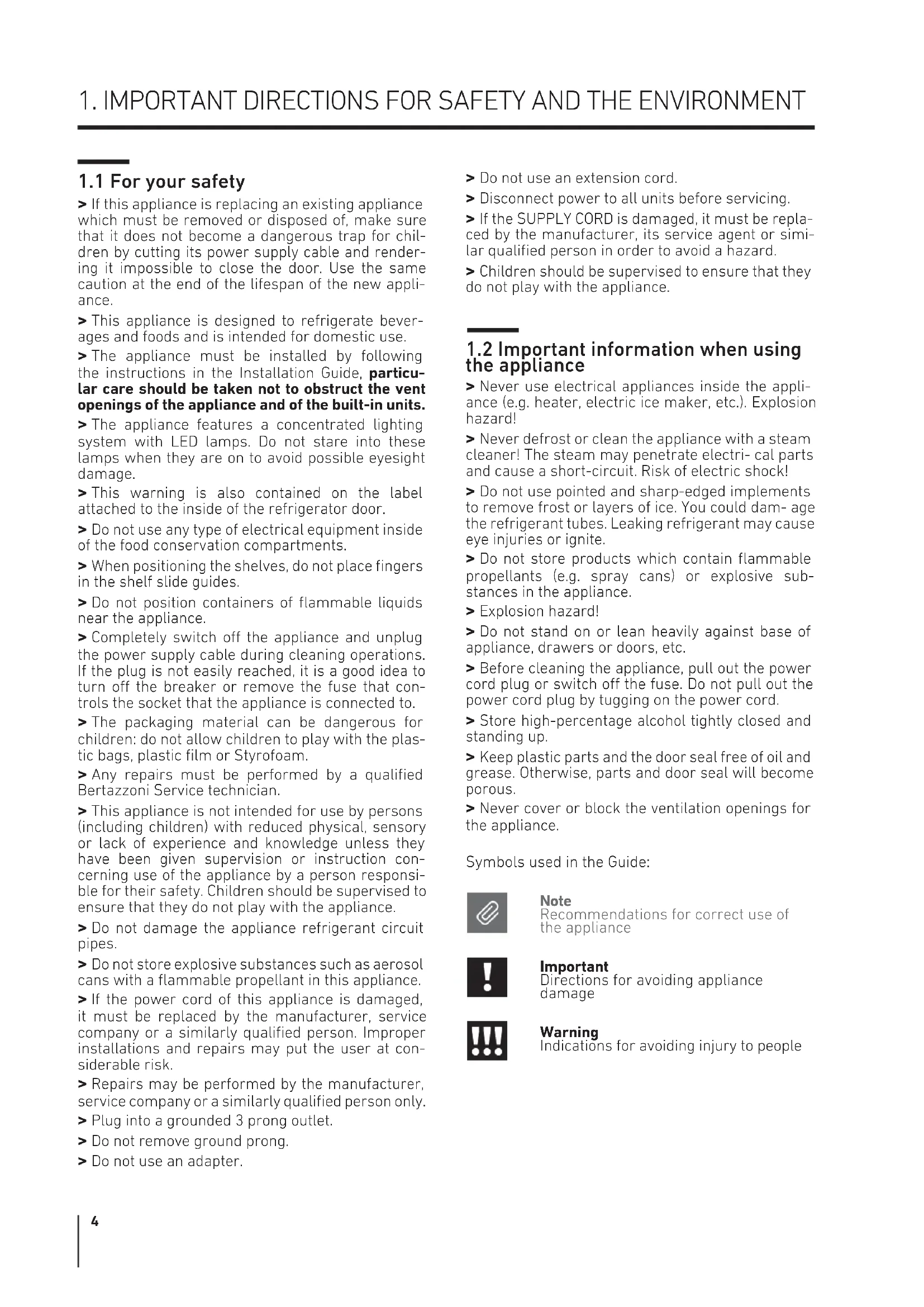 > If this appliance is replacing an existing appliance which must be removed or disposed of, make sure that it does not become a dangerous trap for chil- dren by cutting its power supply cable and render- ing it impossible to close the door. Use the same caution at the end of the lifespan of the new appli- ance. > This appliance is designed to refrigerate bever- ages and foods and is intended for domestic use. > The appliance must be installed by following the instructions in the Installation Guide, particu- lar care should be taken not to obstruct the vent openings of the appliance and of the built-in units. > The appliance features a concentrated lighting system with LED lamps. Do not stare into these lamps when they are on to avoid possible eyesight damage. > This warning is also contained on the label attached to the inside of the refrigerator door. > Do not use any type of electrical equipment inside of the food conservation compartments. > When positioning the shelves, do not place fingers in the shelf slide guides. > Do not position containers of flammable liquids near the appliance. > Completely switch o the appliance and unplug the power supply cable during cleaning operations. If the plug is not easily reached, it is a good idea to turn o the breaker or remove the fuse that con- trols the socket that the appliance is connected to. > The packaging material can be dangerous for children: do not allow children to play with the plas- tic bags, plastic film or Styrofoam. > Any repairs must be performed by a qualified Bertazzoni Service technician. > This appliance is not intended for use by persons (including children) with reduced physical, sensory or lack of experience and knowledge unless they have been given supervision or instruction con- cerning use of the appliance by a person responsi- ble for their safety. Children should be supervised to ensure that they do not play with the appliance. > Do not damage the appliance refrigerant circuit pipes. > Do not store explosive substances such as aerosol cans with a flammable propellant in this appliance. > If the power cord of this appliance is damaged, it must be replaced by the manufacturer, service company or a similarly qualified person. Improper installations and repairs may put the user at con- siderable risk. > Repairs may be performed by the manufacturer, service company or a similarly qualified person only. > Plug into a grounded 3 prong outlet. > Do not remove ground prong. > Do not use an adapter. > Do not use an extension cord. > Disconnect power to all units before servicing. > If the SUPPLY CORD is damaged, it must be repla- ced by the manufacturer, its service agent or simi- lar qualified person in order to avoid a hazard. > Children should be supervised to ensure that they do not play with the appliance.