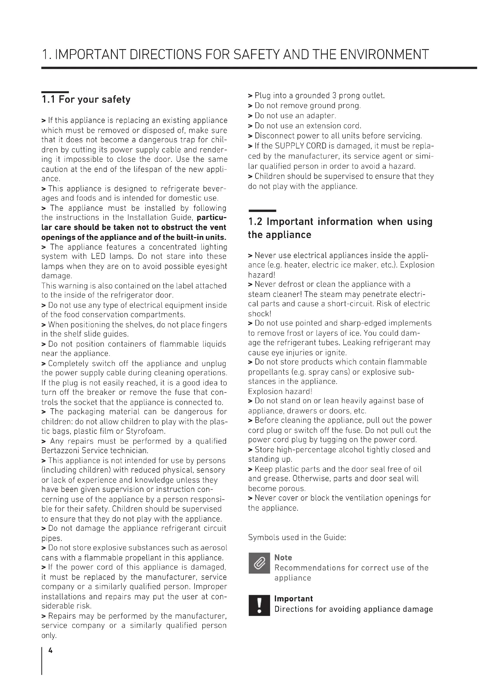 > If this appliance is replacing an existing appliance which must be removed or disposed of, make sure that it does not become a dangerous trap for chil- dren by cutting its power supply cable and render- ing it impossible to close the door. Use the same caution at the end of the lifespan of the new appli- ance. > This appliance is designed to refrigerate bever- ages and foods and is intended for domestic use. > The appliance must be installed by following the instructions in the Installation Guide, particu- lar care should be taken not to obstruct the vent openings of the appliance and of the built-in units. > The appliance features a concentrated lighting system with LED lamps. Do not stare into these lamps when they are on to avoid possible eyesight damage. This warning is also contained on the label attached to the inside of the refrigerator door. > Do not use any type of electrical equipment inside of the food conservation compartments. > When positioning the shelves, do not place fingers in the shelf slide guides. > Do not position containers of flammable liquids near the appliance. > Completely switch o the appliance and unplug the power supply cable during cleaning operations. If the plug is not easily reached, it is a good idea to turn o the breaker or remove the fuse that con- trols the socket that the appliance is connected to. > The packaging material can be dangerous for children: do not allow children to play with the plas- tic bags, plastic film or Styrofoam. > Any repairs must be performed by a qualified Bertazzoni Service technician. > This appliance is not intended for use by persons (including children) with reduced physical, sensory or lack of experience and knowledge unless they have been given supervision or instruction con- cerning use of the appliance by a person responsi- ble for their safety. Children should be supervised to ensure that they do not play with the appliance. > Do not damage the appliance refrigerant circuit pipes. > Do not store explosive substances such as aerosol cans with a flammable propellant in this appliance. > If the power cord of this appliance is damaged, it must be replaced by the manufacturer, service company or a similarly qualified person. Improper installations and repairs may put the user at con- siderable risk. > Repairs may be performed by the manufacturer, service company or a similarly qualified person only. > Plug into a grounded 3 prong outlet. > Do not remove ground prong. > Do not use an adapter. > Do not use an extension cord. > Disconnect power to all units before servicing. > If the SUPPLY CORD is damaged, it must be repla- ced by the manufacturer, its service agent or simi- lar qualified person in order to avoid a hazard. > Children should be supervised to ensure that they do not play with the appliance.