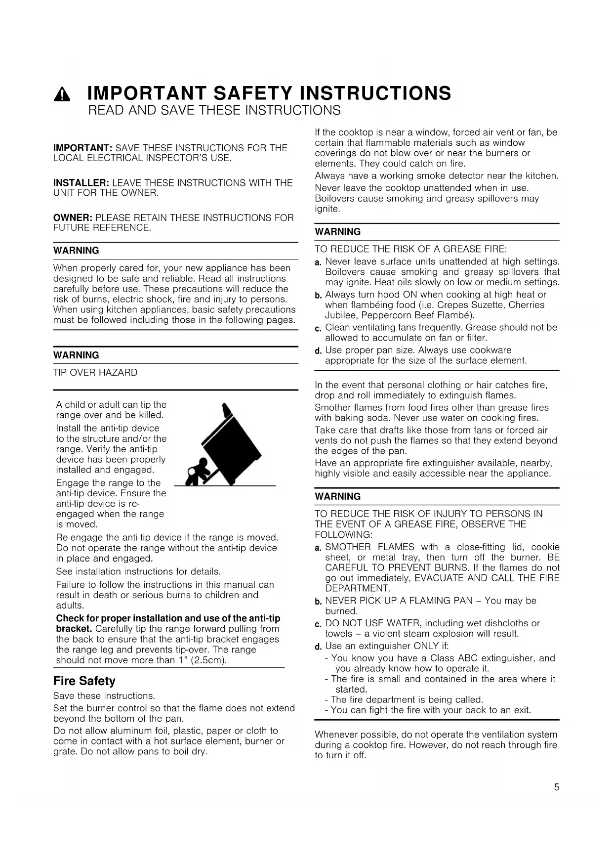 Use an extinguisher ONLY if: - You know you have a Class ABC extinguisher, and you already know how to operate it. - The fire is small and contained in the area where it started. - The fire department is being called. - You can fight the fire with your back to an exit. Whenever possible, do not operate the ventilation system during a cooktop fire. However, do not reach through fire to turn it off. A child or adult can tip the range over and be killed. Install the anti-tip device to the structure and/or the range. Verify the anti-tip device has been properly installed and engaged. Engage the range to the anti-tip device. Ensure the anti-tip device is re- engaged when the range is moved. Re-engage the anti-tip device if the range is moved. Do not operate the range without the anti-tip device in place and engaged. See installation instructions for details. Failure to follow the instructions in this manual can result in death or serious burns to children and adults. Check for proper installation and use of the anti-tip bracket. Carefully tip the range forward pulling from the back to ensure that the anti-tip bracket engages the range leg and prevents tip-over. The range should not move more than 1” (2.5cm).9 IMPORTANT SAFETY INSTRUCTIONS