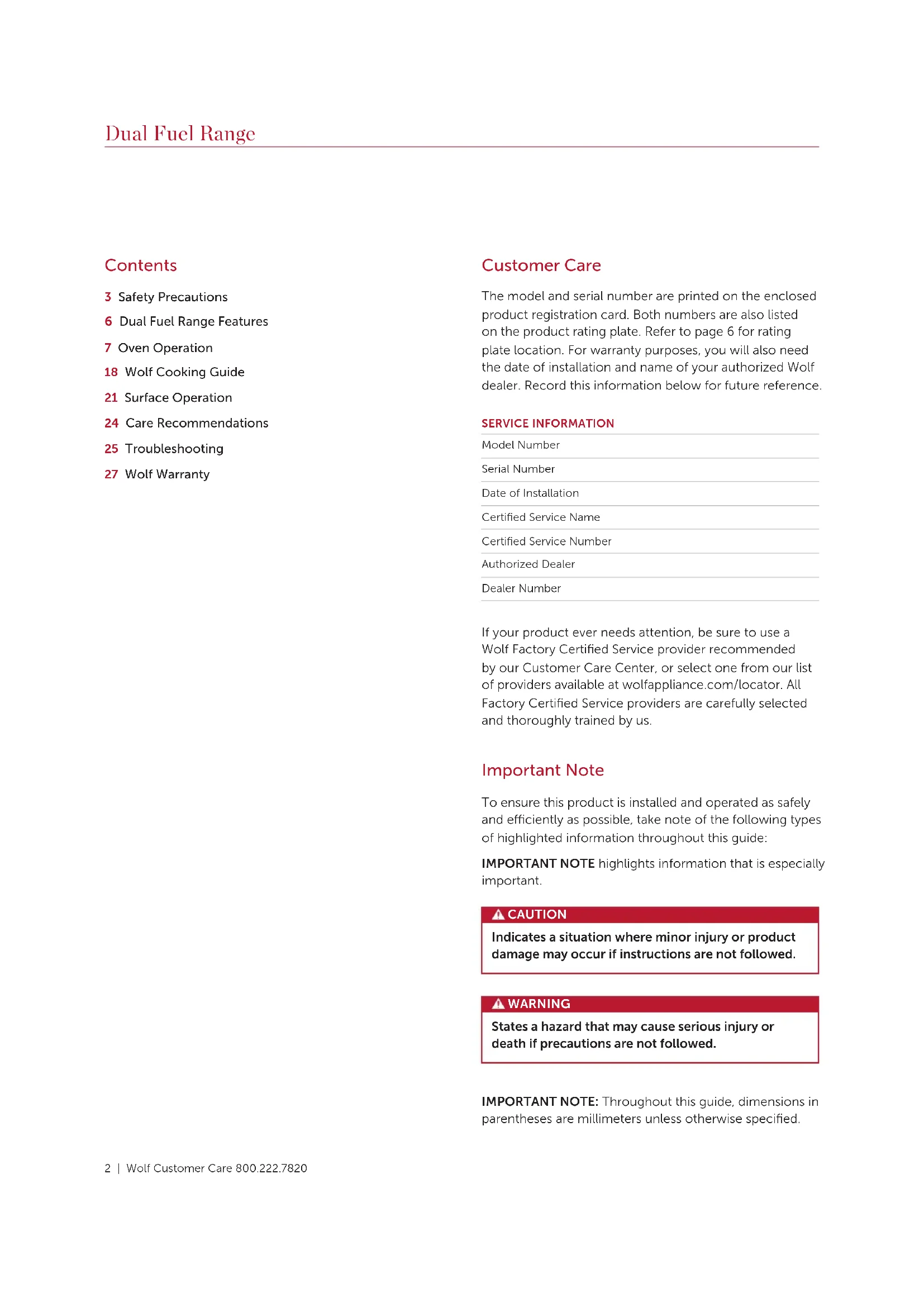 Dual Fuel Range Use and Care Guide CLEANING, MAINTENANCE, AND MORE2 | Wolf Customer Care 800.222.7820 Contents 3 Safety Precautions 6 Dual Fuel Range Features 7 Oven Operation 18 Wolf Cooking Guide 21 Surface Operation 24 Care Recommendations 25 Troubleshooting 27 Wolf Warranty Dual Fuel Range Customer Care The model and serial number are printed on the enclosed product registration card. Both numbers are also listed on the product rating plate. Refer to page 6 for rating plate location. For warranty purposes, you will also need the date of installation and name of your authorized Wolf dealer. Record this information below for future reference. SERVICE INFORMATION Model Number Serial Number Date of Installation Certified Service Name Certified Service Number Authorized Dealer Dealer Number If your product ever needs attention, be sure to use a Wolf Factory Certified Service provider recommended by our Customer Care Center, or select one from our list of providers available at wolfappliance.com/locator. All Factory Certified Service providers are carefully selected and thoroughly trained by us. Important Note To ensure this product is installed and operated as safely and eciently as possible, take note of the following types of highlighted information throughout this guide: IMPORTANT NOTE highlights information that is especially important. CAUTION Indicates a situation where minor injury or product damage may occur if instructions are not followed. WARNING States a hazard that may cause serious injury or death if precautions are not followed. IMPORTANT NOTE: Throughout this guide, dimensions in parentheses are millimeters unless otherwise specified.wolfappliance.com | 3 WARNING A child or adult can tip this appliance and be killed. Verify the anti-tip device has been properly installed and engaged. Ensure the anti-tip device is re-engaged when this appliance is moved. Refer to the illustrations below for how to verify correct installation. Do not operate this appliance without the anti-tip device in place and engaged. Failure to do so can result in death or serious burns to children or adults. To reduce the risk of burns, do not move this appliance while hot. IMPORTANT INSTRUCTIONS WARNING If the information in this guide is not fol- lowed exactly, a fire or explosion may result, causing property damage, personal injury, or death. Do not store or use gasoline or other flam- mable vapors and liquids in the vicinity of this or any other appliance. WHAT TO DO IF YOU SMELL GAS: