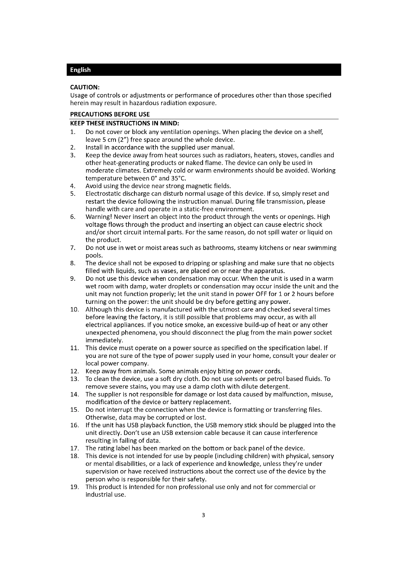 3. Keep the device away from heat sources such as radiators, heaters, stoves, candles and