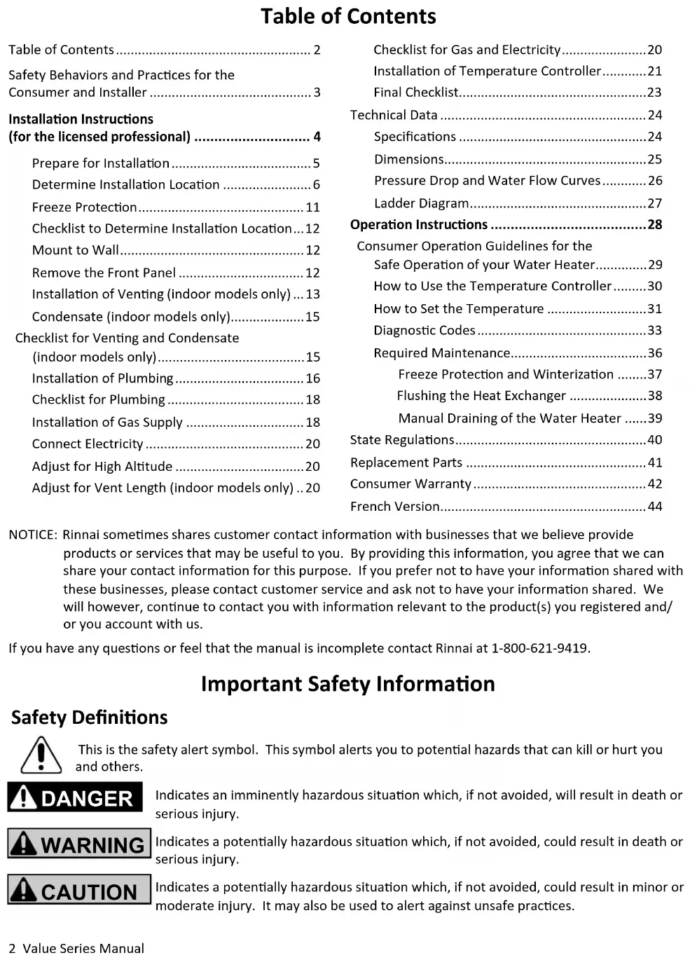 - Important Safety Informaon Safety Denions NOTICE: Rinnai somemes shares customer contact informaon with businesses that we believe provide products or services that may be useful to you. By providing this informaon, you agree that we can share your contact informaon for this purpose. If you prefer not to have your informaon shared with these businesses, please contact customer service and ask not to have your informaon shared. We will however, connue to contact you with informaon relevant to the product(s) you registered and/ or you account with us. If you have any quesons or feel that the manual is incomplete contact Rinnai at 1-800-621-9419.Value Series Manual 3 CAUTION BURN HAZARD. Hot exhaust and vent may cause serious burns. Keep away from the water heater unit. Keep small children and animals away from the unit. Hot water outlet pipes leaving the unit can be hot to touch. In residenal applicaons, insulaon must be used for hot water pipes below 36” due to burn risk to children. Safety Behaviors and Pracces for the Consumer and Installer Before operang, smell all around the appliance area for gas. Be sure to smell next to the oor because some gas is heavier than air and will sele on the oor. Keep the area around the appliance clear and free from combusble materials, gasoline, and other ammable vapors and liquids. Combusble construcon refers to adjacent walls and ceiling and should not be confused with combusble or ammable products and materials. Combusble and/or ammable products and materials should never be stored in the vicinity of this or any gas appliance. Always check the water temperature before entering a shower or bath. To protect yourself from harm, before performing maintenance: Turn o the electrical power supply by unplugging the power cord or by turning o the electricity at the circuit breaker. (The temperature controller does not control the electrical power.) Turn o the gas at the manual gas valve, usually located immediately below the water heater. Turn o the incoming water supply. This can be done at the isolaon valve immediately below the water heater or by turning o the water supply to the building. WARNING Use only your hand to push in or turn the gas control knob. Never use tools. If the knob will not push in or turn by hand, do not try to repair it; call a licensed professional. Force or aempted repair may result in a re or explosion. Do not use this appliance if any part has been under water. Immediately call a licensed professional to inspect the appliance and to replace any part of the control system and any gas control which has been under water. Do not use substute materials. Use only parts cered for the appliance. Should overheang occur or the gas supply fail to shut o, turn o the manual gas control valve to the appliance. Do not adjust the DIP switch unless specically instructed to do so. Do not use an extension cord or an adapter plug with this appliance. Any alteraon to the appliance or its controls can be dangerous and will void the warranty. Proper venng is required for the safe operaon of this appliance. Ensure appliance venng is not blocked or parally blocked. Ensure that in cases of freezing weather the water heater and its water lines are protected to prevent freezing. California law requires this noce to be provided: California Proposion 65: This product contains chemicals known to the state of California to cause cancer, birth defects, or other reproducve harm. WARNING4 Value Series Manual A licensed professional must install the appliance, inspect it, and leak test it before use. The warranty will be voided due to improper installaon. The installer should have skills such as: gas sizing connecng gas lines, water lines, valves, electricity, knowledge of applicable naonal, state, and local codes. installing venng through a wall or roof training in installaon of tankless water heaters. (Training can be accessed online at www.trainingevents.rinnai.us) Installaon Instrucons (for the licensed professional) Installaon Steps Prepare for Installaon p. 5