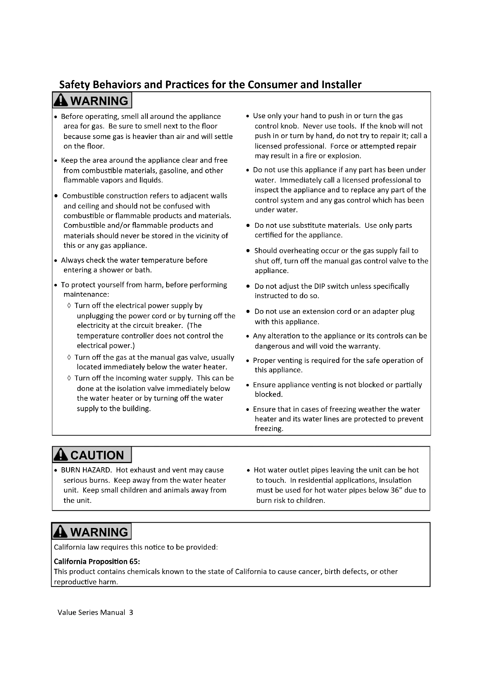 about 0.2 inch thick To avoid burns, wait unl the equipment cools down before draining the water. The water in the appliance will remain hot aer it is turned o. WARNING Water lter Hot water outlet Cold water inlet40 Value Series Manual NOTICE BEFORE INSTALLATION This direct-vent appliance must be installed by a licensed professional. If you are not properly trained, you must not install this unit. IMPORTANT: In the State of Massachuses (248 CMR 4.00 & 5.00) For all side wall horizontally vented gas fueled equipment installed in every dwelling, building or structure used in whole or in part for residenal purposes, including those owned or operated by the Commonwealth and where the side wall exhaust vent terminaon is less than seven (7) feet above nished grade in the area of the venng, including but not limited to decks and porches, the following requirements shall be sased: