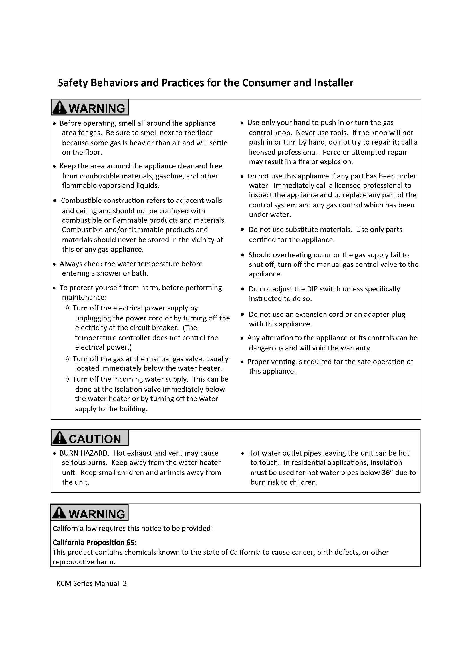- Important Safety Informaon Safety Denions NOTICE: Rinnai somemes shares customer contact informaon with businesses that we believe provide products or services that may be useful to you. By providing this informaon, you agree that we can share your contact informaon for this purpose. If you prefer not to have your informaon shared with these businesses, please contact customer service and ask not to have your informaon shared. We will however, connue to contact you with informaon relevant to the product(s) you registered and/ or your account with us. If you have any quesons or feel that the manual is incomplete contact Rinnai at 1-800-621-9419.KCM Series Manual 3 CAUTION BURN HAZARD. Hot exhaust and vent may cause serious burns. Keep away from the water heater unit. Keep small children and animals away from the unit. Hot water outlet pipes leaving the unit can be hot to touch. In residenal applicaons, insulaon must be used for hot water pipes below 36” due to burn risk to children. Safety Behaviors and Pracces for the Consumer and Installer Before operang, smell all around the appliance area for gas. Be sure to smell next to the oor because some gas is heavier than air and will sele on the oor. Keep the area around the appliance clear and free from combusble materials, gasoline, and other ammable vapors and liquids. Combusble construcon refers to adjacent walls and ceiling and should not be confused with combusble or ammable products and materials. Combusble and/or ammable products and materials should never be stored in the vicinity of this or any gas appliance. Always check the water temperature before entering a shower or bath. To protect yourself from harm, before performing maintenance: Turn o the electrical power supply by unplugging the power cord or by turning o the electricity at the circuit breaker. (The temperature controller does not control the electrical power.) Turn o the gas at the manual gas valve, usually located immediately below the water heater. Turn o the incoming water supply. This can be done at the isolaon valve immediately below the water heater or by turning o the water supply to the building. WARNING Use only your hand to push in or turn the gas control knob. Never use tools. If the knob will not push in or turn by hand, do not try to repair it; call a licensed professional. Force or aempted repair may result in a re or explosion. Do not use this appliance if any part has been under water. Immediately call a licensed professional to inspect the appliance and to replace any part of the control system and any gas control which has been under water. Do not use substute materials. Use only parts cered for the appliance. Should overheang occur or the gas supply fail to shut o, turn o the manual gas control valve to the appliance. Do not adjust the DIP switch unless specically instructed to do so. Do not use an extension cord or an adapter plug with this appliance. Any alteraon to the appliance or its controls can be dangerous and will void the warranty. Proper venng is required for the safe operaon of this appliance. California law requires this noce to be provided: California Proposion 65: This product contains chemicals known to the state of California to cause cancer, birth defects, or other reproducve harm. WARNING4 KCM Series Manual A licensed professional must install the appliance, inspect it, and leak test it before use. The warranty will be voided due to any improper installaon. The installer should have skills such as: Gas sizing. Connecng gas lines, water lines, valves, and electricity. Knowledge of applicable naonal, state, and local codes. Installing venng through a wall or roof. Training in installaon of tankless water heaters. (Training can be accessed on-line at www.trainingevents.rinnai.us) Installaon Steps Prepare for Installaon p. 5