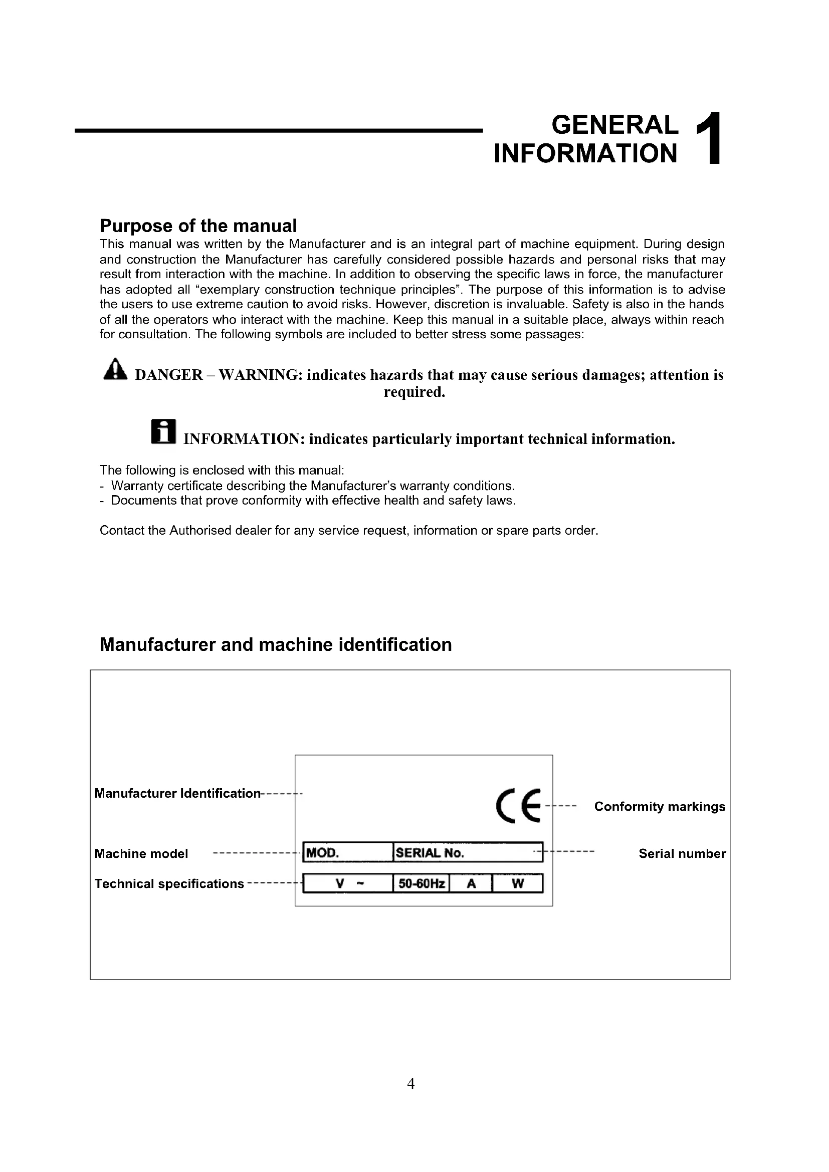 Purpose of the manual This manual was written by the Manufacturer and is an integral part of machine equipment. During design and construction the Manufacturer has carefully considered possible hazards and personal risks that may result from interaction with the machine. In addition to observing the specific laws in force, the manufacturer has adopted all “exemplary construction technique principles”. The purpose of this information is to advise the users to use extreme caution to avoid risks. However, discretion is invaluable. Safety is also in the hands of all the operators who interact with the machine. Keep this manual in a suitable place, always within reach for consultation. The following symbols are included to better stress some passages: DANGER – WARNING: indicates hazards that may cause serious damages; attention is required. INFORMATION: indicates particularly important technical information. The following is enclosed with this manual: - Warranty certificate describing the Manufacturer’s warranty conditions. - Documents that prove conformity with effective health and safety laws. Contact the Authorised dealer for any service request, information or spare parts order. Manufacturer and machine identification Manufacturer Identification Machine model Technical specifications Conformity markings Serial number5 GENERAL INFORMATION