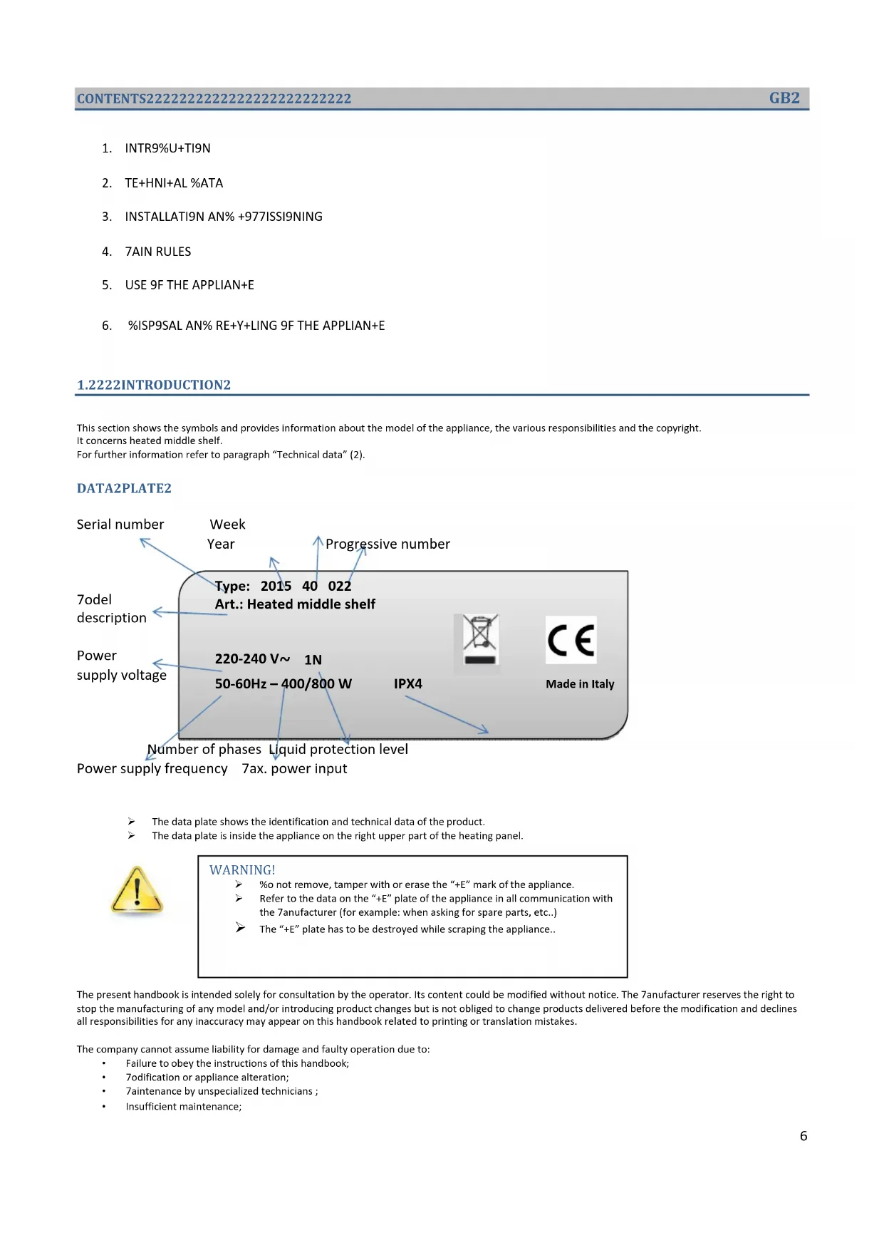 WARNING! Do not remove, tamper with or erase the “CE” mark of the appliance. Refer to the data on the “CE” plate of the appliance in all communication with the Manufacturer (for example: when asking for spare parts, etc..) The “CE” plate has to be destroyed while scraping the appliance..7