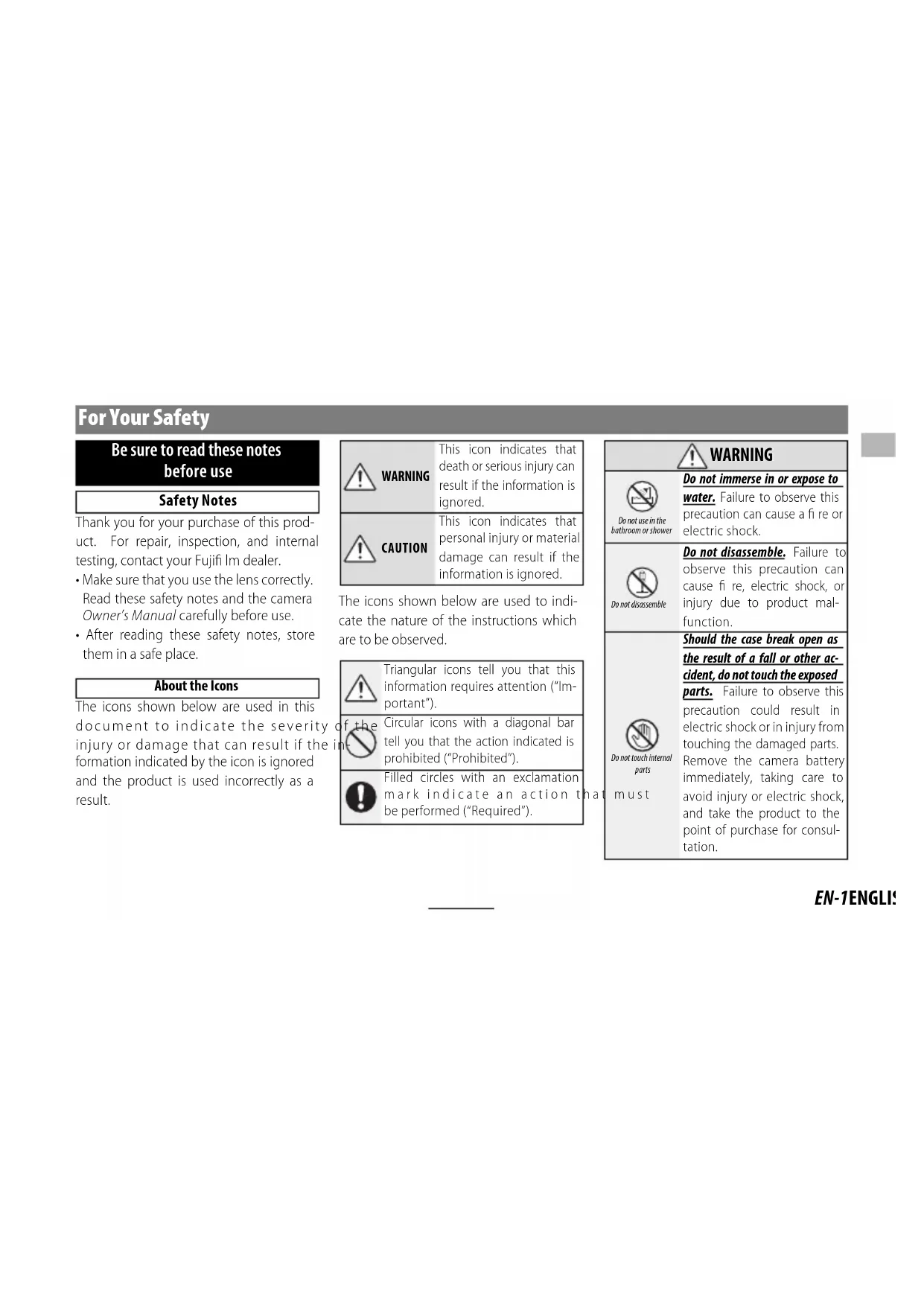 - After reading these safety notes, store them in a safe place. About the Icons The icons shown below are used in this document to indicate the severity of the injury or damage that can result if the in- formation indicated by the icon is ignored and the product is used incorrectly as a result. WARNINGThis icon indicates that death or serious injury can result if the information is ignored.CAUTIONThis icon indicates that personal injury or material damage can result if the information is ignored. The icons shown below are used to indi- cate the nature of the instructions which are to be observed. Triangular icons tell you that this information requires attention (“Im-portant”).Circular icons with a diagonal bar tell you that the action indicated is prohibited (“Prohibited”).Filled circles with an exclamation mark indicate an action that must be performed (“Required”). WARNING WARNING Do not use in the bathroom or showerDo not immerse in or expose to water. Failure to observe this precaution can cause a fi re or electric shock.Do not disassembleDo not disassemble. Failure to observe this precaution can cause fi re, electric shock, or injury due to product mal-function.Do not touch internal partsShould the case break open as the result of a fall or other ac-cident, do not touch the exposed parts. Failure to observe this precaution could result in electric shock or in injury from touching the damaged parts. Remove the camera battery immediately, taking care to avoid injury or electric shock, and take the product to the point of purchase for consul-tation.EN-2 ENGLISH WARNING WARNING Do not place on unstable sur- faces. The product may fall, causing injury. Do not view the sun through the lens or camera view nders. Failure to observe this precau- tion can cause permanent visual impairment. CAUTION CAUTION Do not use or store in locations that are exposed to steam, or smoke or are very humid or extremely dusty. Failure to observe this precaution can cause fi re or electric shock. Do not leave in direct sunlight or in locations subject to very high temperatures, such as in a closed vehicle on a sunny day. Failure to observe this precau- tion can cause fi re. CAUTION CAUTION Keep out of the reach of small children. This product could cause injury in the hands of a child. Do not handle with wet hands. Failure to observe this precau- tion can cause electric shock. Keep the sun out of the frame when shooting backlit subjects. Sunlight focused into the camera when the sun is in or close to the frame can cause fi r e o r b u r n s . When the product is not in use, replace the lens caps and store out of direct sunlight. Sunlight focused by the lens can cause fi r e o r b u r n s . Do not carry the camera or lens while they are attached to a tripod. The product can fall or strike other objects, caus- ing injury. For Customers in the U. S. A. For Customers in the U. S. A. Tested To Comply With FCC Standards