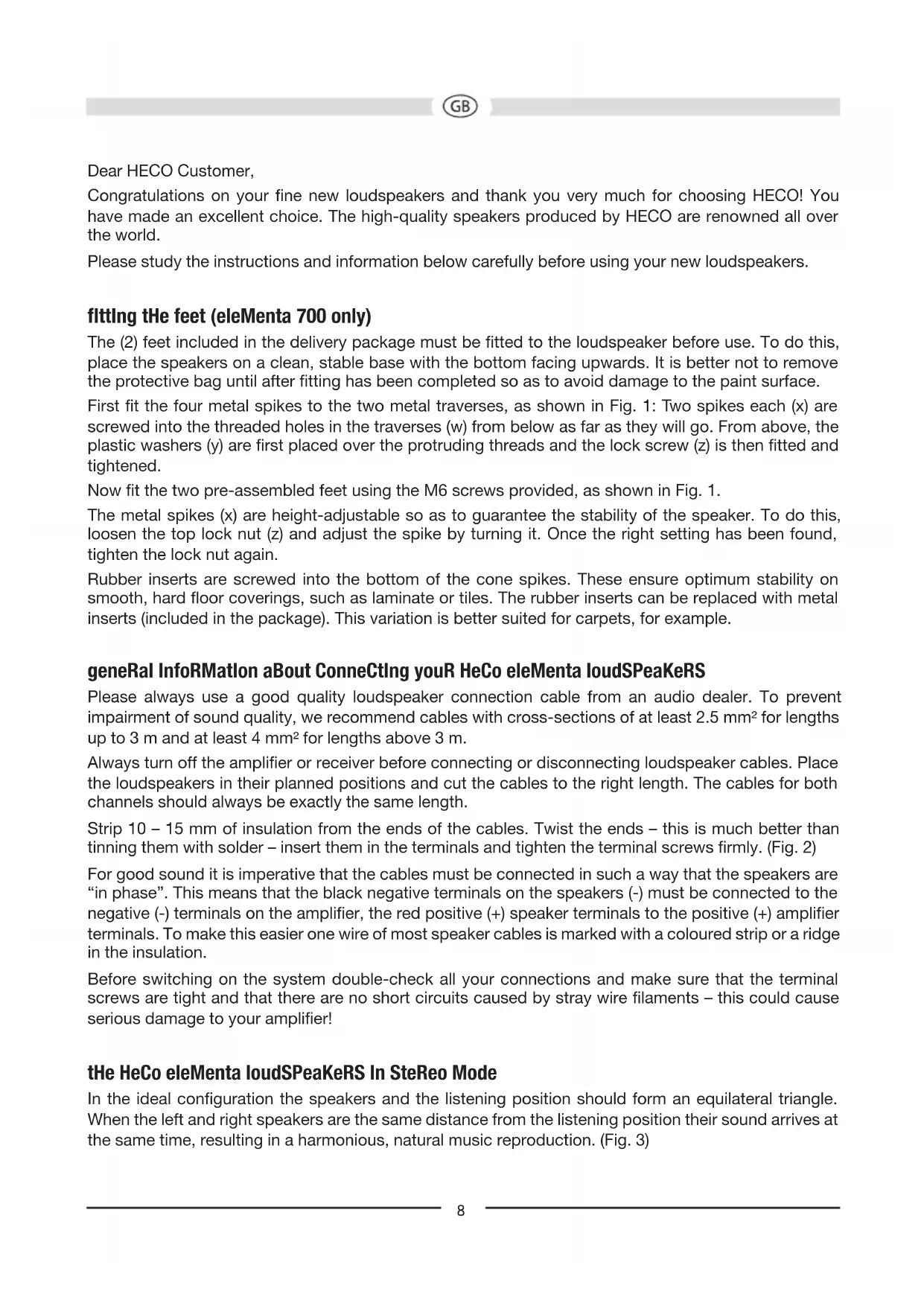 teCHnISCHe daten elementa 700 elementa 300 elementa CenteR 30 Konfiguration: 3 Wege Bassreflex 2 Wege Bassreflex 2 Wege Bassreflex Belastbarkeit: 200 / 300 Watt 90 / 150 Watt 110 / 170 Watt Impedanz: 4 – 8 Ohm 4 – 8 Ohm 4 – 8 Ohm Frequenzbereich: 25 – 45 000 Hz 32 – 45 000 Hz 33 – 45 000 Hz Empfohlene Verstärker- leistung: 30 – 300 Watt 30 – 150 Watt 30 – 170 Watt Wirkungsgrad (1 Watt/1 m): 92 dB 90 dB 90 dB Maße (BxHxT): 226 x 1100 x 352 mm 226 x 368 x 307 mm 510 x 178 x 278 mm Zubehör: Metallspikes Gummispikes Gummispikes Gummispikes Technische Änderungen vorbehalten.Dear HECO Customer, Congratulations on your fine new loudspeakers and thank you very much for choosing HECO! You have made an excellent choice. The high-quality speakers produced by HECO are renowned all over the world. Please study the instructions and information below carefully before using your new loudspeakers. fIttIng tHe feet (elementa 700 only) The (2) feet included in the delivery package must be fitted to the loudspeaker before use. To do this, place the speakers on a clean, stable base with the bottom facing upwards. It is better not to remove the protective bag until after fitting has been completed so as to avoid damage to the paint surface. First fit the four metal spikes to the two metal traverses, as shown in Fig. 1: Two spikes each (x) are screwed into the threaded holes in the traverses (w) from below as far as they will go. From above, the plastic washers (y) are first placed over the protruding threads and the lock screw (z) is then fitted and tightened. Now fit the two pre-assembled feet using the M6 screws provided, as shown in Fig. 1. The metal spikes (x) are height-adjustable so as to guarantee the stability of the speaker. To do this, loosen the top lock nut (z) and adjust the spike by turning it. Once the right setting has been found, tighten the lock nut again. Rubber inserts are screwed into the bottom of the cone spikes. These ensure optimum stability on smooth, hard floor coverings, such as laminate or tiles. The rubber inserts can be replaced with metal inserts (included in the package). This variation is better suited for carpets, for example. geneRal InfoRmatIon aBout ConneCtIng youR HeCo elementa loudSPeaKeRS Please always use a good quality loudspeaker connection cable from an audio dealer. To prevent impairment of sound quality, we recommend cables with cross-sections of at least 2.5 mm² for lengths up to 3 m and at least 4 mm² for lengths above 3 m. Always turn off the amplifier or receiver before connecting or disconnecting loudspeaker cables. Place the loudspeakers in their planned positions and cut the cables to the right length. The cables for both channels should always be exactly the same length. Strip 10 – 15 mm of insulation from the ends of the cables. Twist the ends – this is much better than tinning them with solder – insert them in the terminals and tighten the terminal screws firmly. (Fig. 2) For good sound it is imperative that the cables must be connected in such a way that the speakers are “in phase”. This means that the black negative terminals on the speakers (-) must be connected to the negative (-) terminals on the amplifier, the red positive (+) speaker terminals to the positive (+) amplifier terminals. To make this easier one wire of most speaker cables is marked with a coloured strip or a ridge in the insulation. Before switching on the system double-check all your connections and make sure that the terminal screws are tight and that there are no short circuits caused by stray wire filaments – this could cause serious damage to your amplifier! tHe HeCo elementa loudSPeaKeRS In SteReo mode In the ideal configuration the speakers and the listening position should form an equilateral triangle. When the left and right speakers are the same distance from the listening position their sound arrives at the same time, resulting in a harmonious, natural music reproduction. (Fig. 3) 8There should be a clear line of sight between the loudspeakers and the listening position. Any sound- absorbing or reflecting obstacles in the path will distort the sound. When you install the loudspeakers the following distances should be maintained: Floorstanders: at least 20 cm away from the rear wall and at least 30 cm from the side walls. This will prevent excessive emphasis of the bass range. Bookshelf speakers: shelf loudspeakers should also be as free-standing as possible, the distance to the sides and rear to walls and items should be at least 10 cm, the tweeters should be located at ear height. Spikes (floorstanders): you should use the supplied spikes when setting the speakers up. This isolates them from the supporting surface, preventing unpleasant resonance effects. You can choose between metal and hard rubber spikes for the standing speakers. The spikes are screwed into the threaded bushes on the bottom of the speaker. HECO ELEMENTA LOUDSPEAKERS AS A FRONT OR REAR LOUDSPEAKER The front loudspeakers are positioned at ear height on the left and right as equidistant from the television as possible. The rear loudspeakers are placed at ear height or a little above on the left and right besides or better behind the listening position. (Fig. 4) CONNECTOR PANEL ON THE HECO ELEMENTA LOUDSPEAKERS / BI-WIRING AND BI-AMPING HECO ELEMENTA 700 The connector panels on the ELEMENTA speakers are equipped with 5 terminal screws, enabling bi-wiring/bi-amping in addition to conventional connection to an amplifier. The upper terminals are connected to the treble and mid-treble side of the crossover and the lower terminals to the bass side. An additional connector terminal enables a 2dB treble boost option. Bi-wiring means using separate cables to carry the high and low audio frequencies. Bi-amping takes this idea one step further and uses separate power amplifiers as well as separate cables for high and low frequencies. Bi-amping in particular produces an additional 