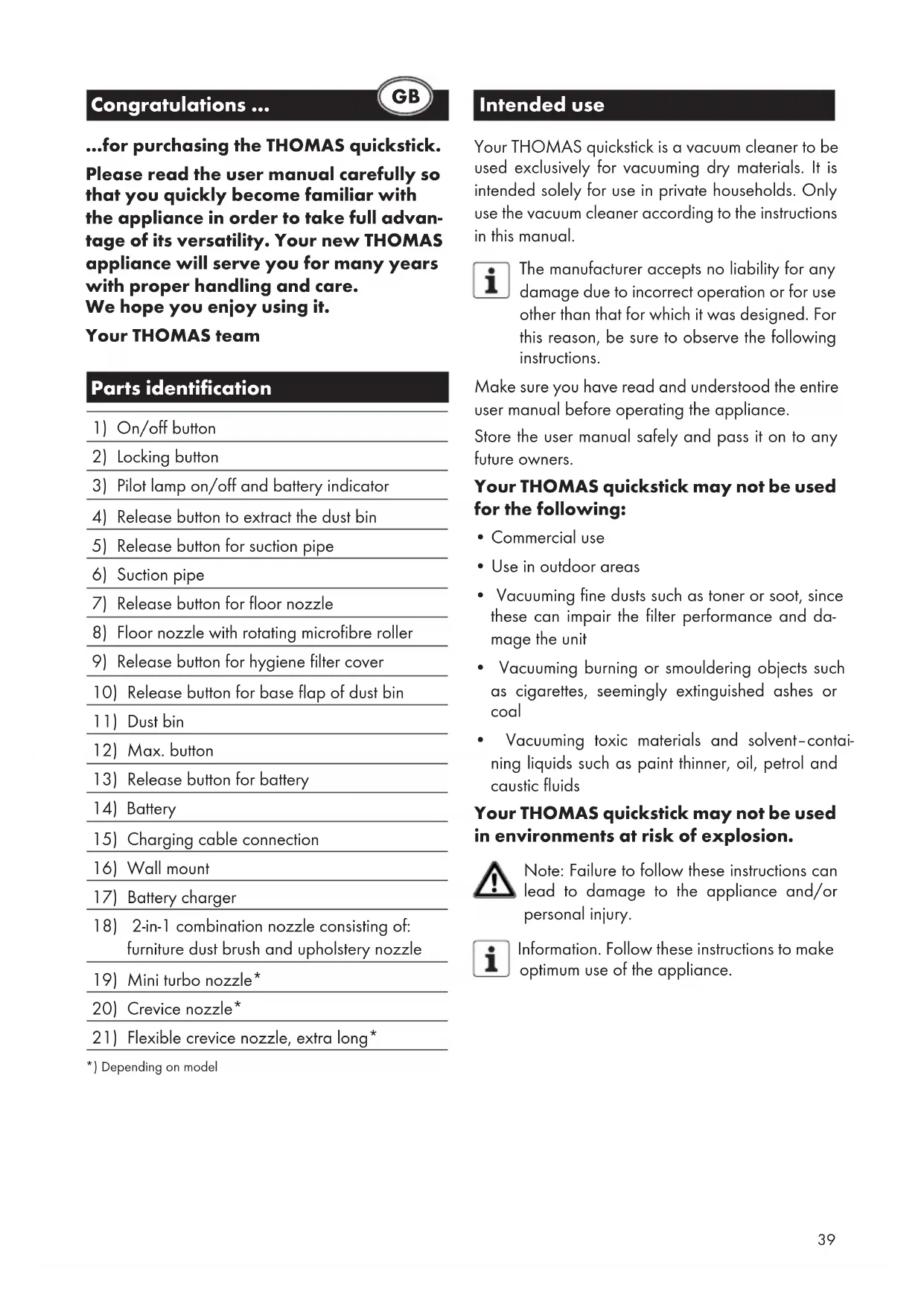 - Vacuuming toxic materials and solvent–contai- ning liquids such as paint thinner, oil, petrol and caustic fluids Your THOMAS quickstick may not be used in environments at risk of explosion. Note: Failure to follow these instructions can lead to damage to the appliance and/or personal injury. Information. Follow these instructions to make optimum use of the appliance. GB40 Safety instructions