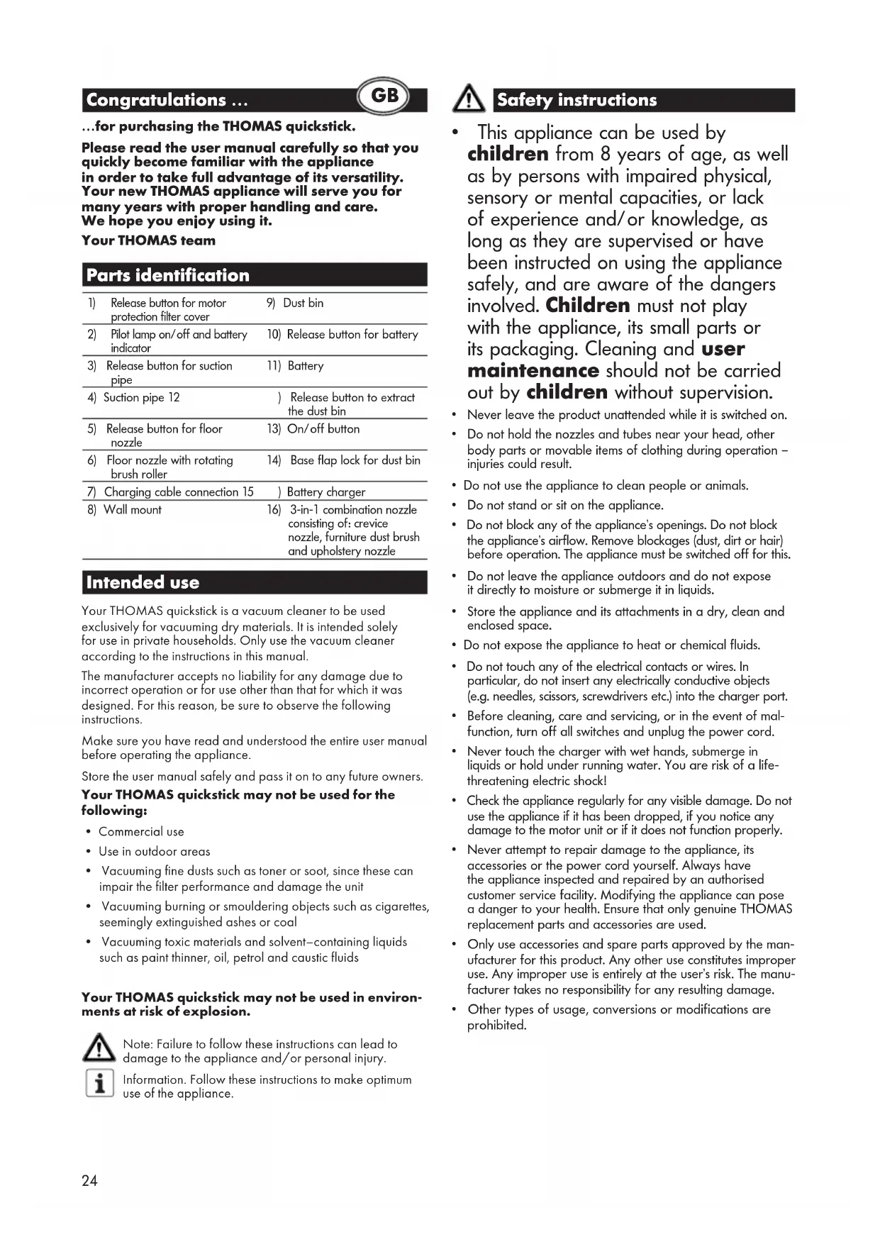 - Vacuuming toxic materials and solvent–containing liquids such as paint thinner, oil, petrol and caustic fluids Your THOMAS quickstick may not be used in environ- ments at risk of explosion. Note: Failure to follow these instructions can lead to damage to the appliance and/or personal injury. Information. Follow these instructions to make optimum use of the appliance. Safety instructions