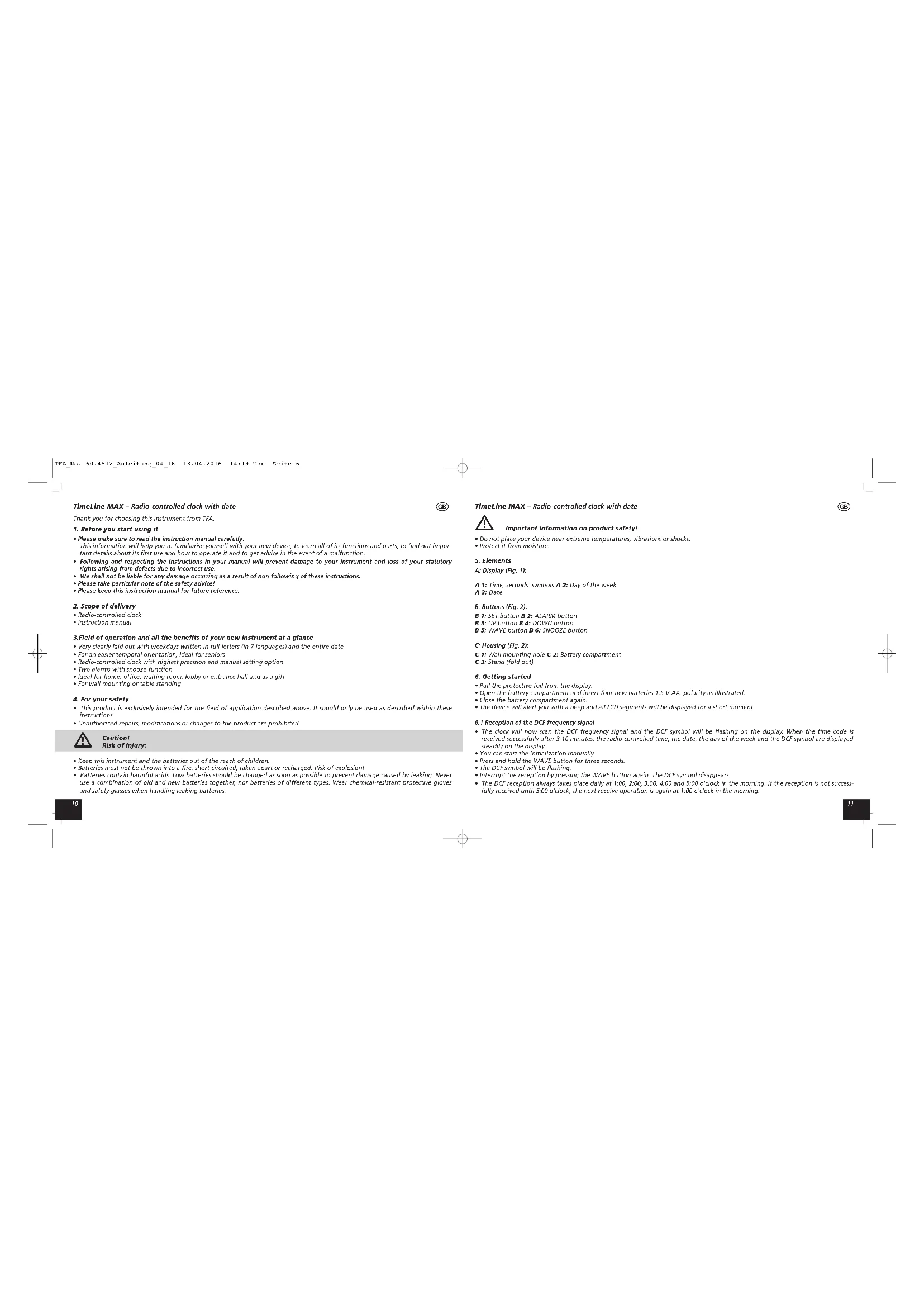 - Batteries contain harmful acids. Low batteries should be changed as soon as possible to prevent damage caused by leaking. Never use a combination of old and new batteries together, nor batteries of different types. Wear chemical-resistant protective gloves and safety glasses when handling leaking batteries. TFA_No. 60.4512_Anleitung_04_16 13.04.2016 14:19 Uhr Seite 61312 TimeLine MAX – Radio-controlled clock with date