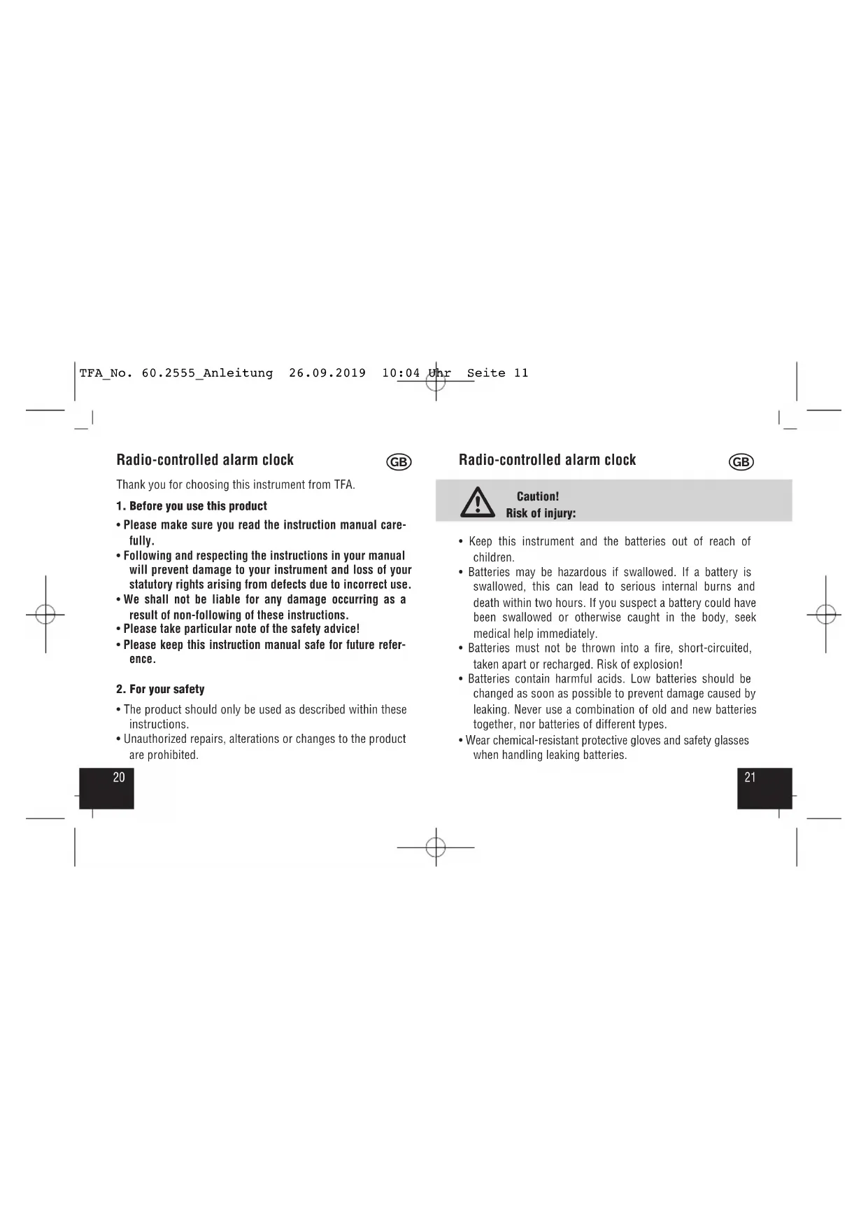 - Within concrete walls (reinforced with steel) such as base- ments, the received signal is naturally weakened. In extreme cases, please place the unit close to a window to improve reception. TFA_No. 60.2555_Anleitung 26.09.2019 10:04 Uhr Seite 132726 Radio-controlled alarm clock
